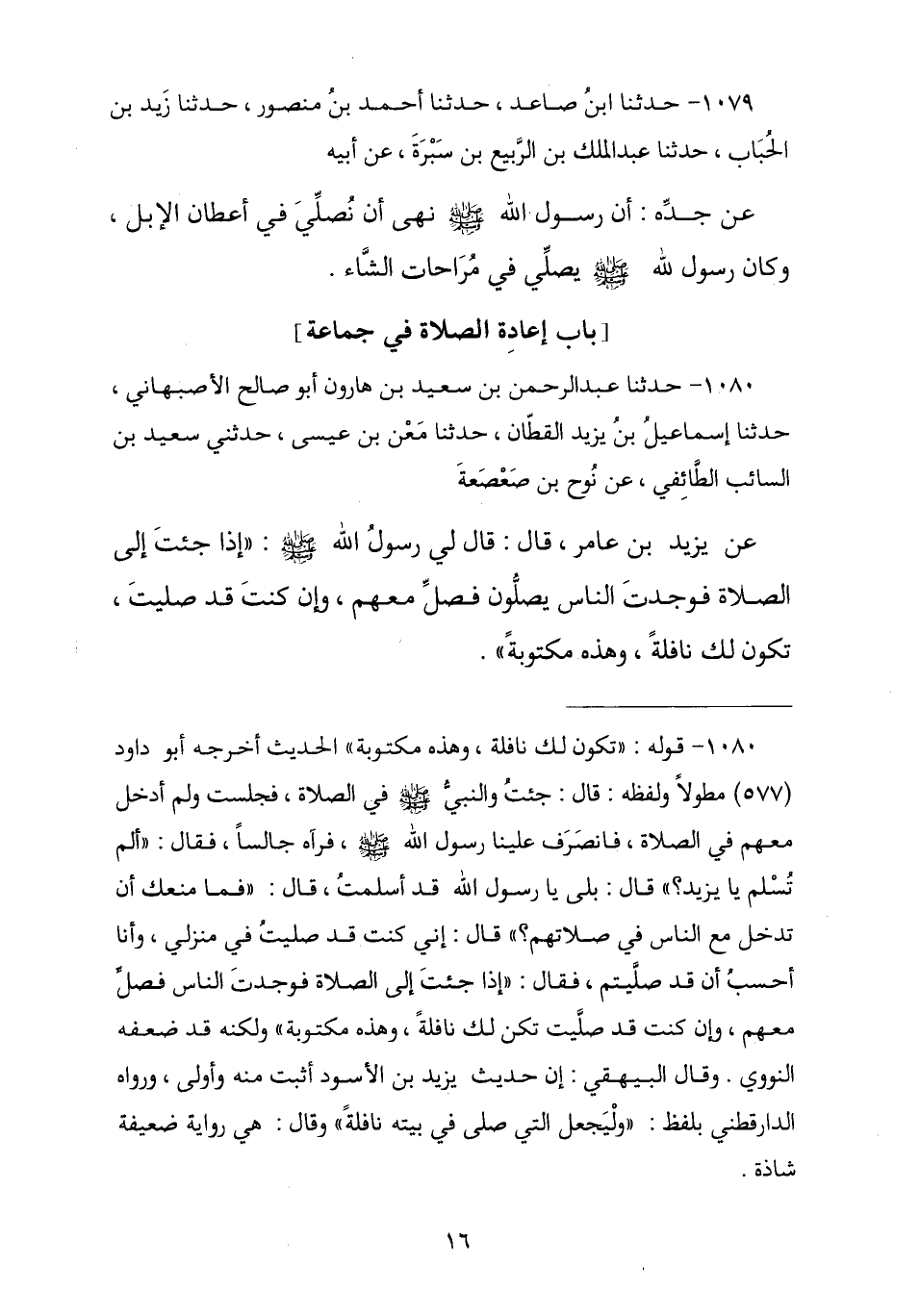 1080 - حَدَّثَنَا أَبُو صَالِحٍ الْأَصْبَهَانِيُّ عَبْدُ الرَّحْمَنِ بْنُ سَعِيدِ بْنِ هَارُونَ , نا إِسْمَاعِيلُ بْنُ يَزِيدَ الْقَطَّانُ , نا مَعْنُ بْنُ عِيسَى , حَدَّثَنِي سَعِيدُ بْنُ السَّائِبِ الطَّائِفِيُّ , عَنْ نُوحِ بْنِ صَعْصَعَةَ , عَنْ يَزِيدَ بْنِ عَامِرٍ , قَالَ: قَالَ لِي رَسُولُ اللَّهِ صَلَّى اللهُ عَلَيْهِ وَسَلَّمَ: § «إِذَا جِئْتَ إِلَى الصَّلَاةِ فَوَجَدْتَ النَّاسَ يُصَلُّونَ فَصَلِّ مَعَهُمْ , وَإِنْ كُنْتَ قَدْ صَلَّيْتَ تَكُونُ لَكَ نَافِلَةً وَهَذِهِ مَكْتُوبَةٌ»