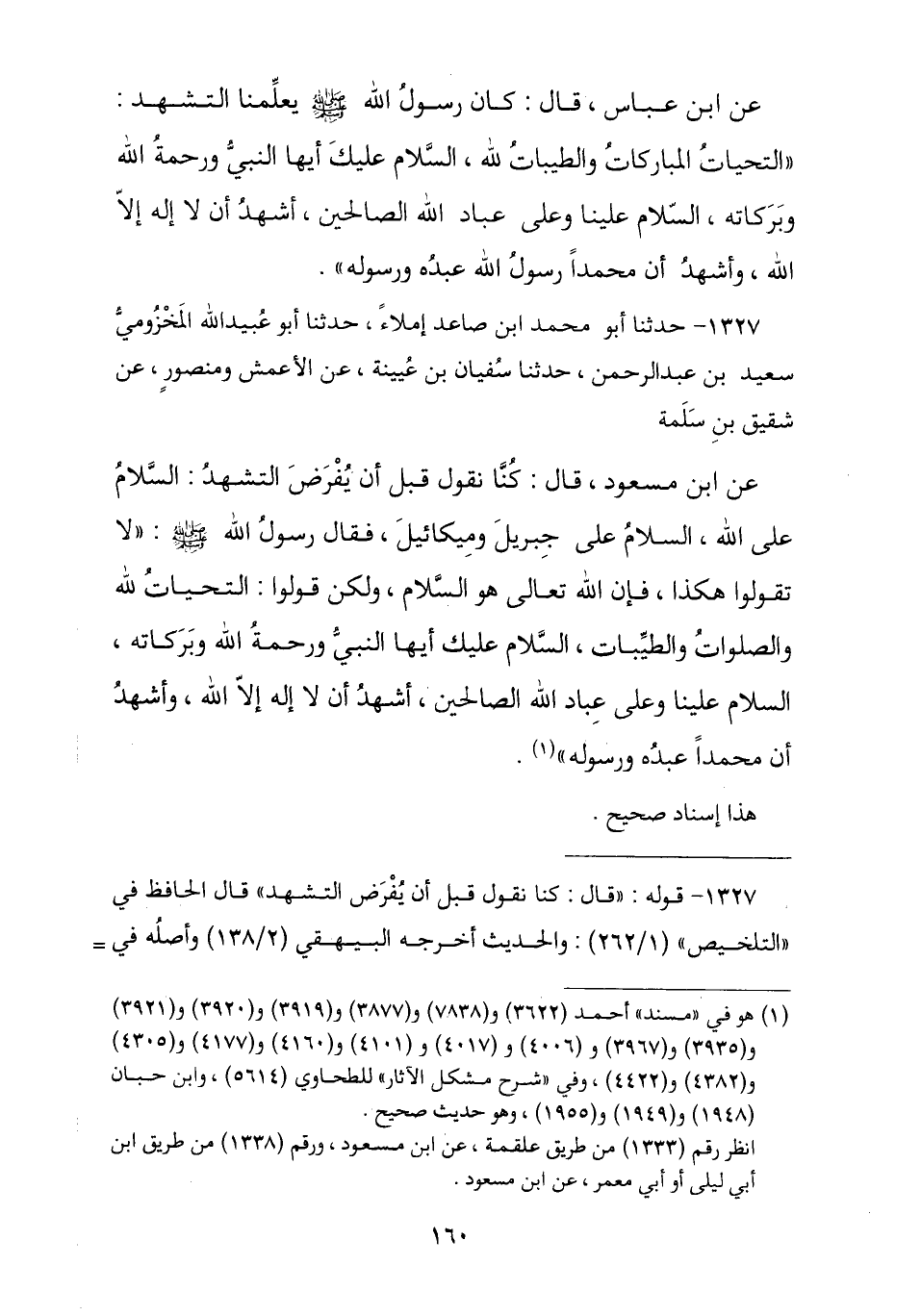 1327 - حَدَّثَنَا أَبُو مُحَمَّدٍ يَحْيَى بْنُ مُحَمَّدِ بْنِ صَاعِدٍ إِمْلَاءً , ثنا أَبُو عُبَيْدِ اللَّهِ الْمَخْزُومِيُّ سَعِيدُ بْنُ عَبْدِ الرَّحْمَنِ , ثنا سُفْيَانُ بْنُ عُيَيْنَةَ , عَنِ الْأَعْمَشِ , وَمَنْصُورٍ , عَنْ شَقِيقِ بْنِ سَلَمَةَ , عَنِ ابْنِ مَسْعُودٍ , قَالَ: كُنَّا نَقُولُ قَبْلَ أَنْ يُفْرَضَ التَّشَهُّدُ: السَّلَامُ عَلَى اللَّهِ السَّلَامُ عَلَى جِبْرِيلَ وَمِيكَائِيلَ , فَقَالَ رَسُولُ اللَّهِ صَلَّى اللهُ عَلَيْهِ وَسَلَّمَ: " لَا تَقُولُوا هَكَذَا فَإِنَّ اللَّهَ هُوَ السَّلَامُ , وَلَكِنْ قُولُوا: §التَّحِيَّاتُ لِلَّهِ وَالصَّلَوَاتُ وَالطَّيِّبَاتُ السَّلَامُ عَلَيْكَ أَيُّهَا النَّبِيُّ وَرَحْمَةُ اللَّهِ وَبَرَكَاتُهُ السَّلَامُ عَلَيْنَا وَعَلَى عِبَادِ اللَّهِ الصَّالِحِينَ أَشْهَدُ أَنْ لَا إِلَهَ إِلَّا اللَّهُ وَأَشْهَدُ أَنَّ مُحَمَّدًا عَبْدُهُ وَرَسُولُهُ ". هَذَا إِسْنَادٌ صَحِيحٌ -[161]-