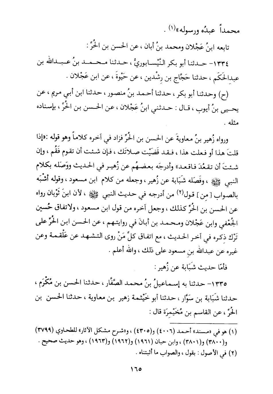1335 - فَحَدَّثَنَا إِسْمَاعِيلُ بْنُ مُحَمَّدٍ الصَّفَّارُ , ثنا الْحَسَنُ بْنُ مُكْرَمٍ , ثنا شَبَابَةُ بْنُ سَوَّارٍ , ثنا أَبُو خَيْثَمَةَ زُهَيْرُ بْنُ مُعَاوِيَةَ , ثنا الْحَسَنُ بْنُ الْحَرِّ , عَنِ الْقَاسِمِ بْنِ مُخَيْمِرَةَ , -[166]- قَالَ: أَخَذَ عَلْقَمَةُ بِيَدِي قَالَ: وَأَخَذَ عَبْدُ اللَّهِ بْنُ مَسْعُودٍ بِيَدِي قَالَ: أَخَذَ رَسُولُ اللَّهِ صَلَّى اللهُ عَلَيْهِ وَسَلَّمَ بِيَدِي فَعَلَّمَنِي التَّشَهُّدَ: § «التَّحِيَّاتُ لِلَّهِ وَالصَّلَوَاتُ وَالطَّيِّبَاتُ , السَّلَامُ عَلَيْكَ أَيُّهَا النَّبِيُّ وَرَحْمَةُ اللَّهِ وَبَرَكَاتُهُ , السَّلَامُ عَلَيْنَا وَعَلَى عِبَادِ اللَّهِ الصَّالِحِينَ , أَشْهَدُ أَنْ لَا إِلَهَ إِلَّا اللَّهُ وَأَشْهَدُ أَنَّ مُحَمَّدًا عَبْدُهُ وَرَسُولُهُ». قَالَ عَبْدُ اللَّهِ: فَإِذَا قُلْتَ ذَلِكَ فَقَدْ قَضَيْتَ مَا عَلَيْكَ مِنَ الصَّلَاةِ فَإِذَا شِئْتَ أَنْ تَقُومَ فَقُمْ وَإِنْ شِئْتَ أَنْ تَقْعُدَ فَاقْعُدْ. شَبَابَةُ ثِقَةٌ , وَقَدْ فَصَلَ آخِرَ الْحَدِيثِ جَعَلَهُ مِنْ قَوْلِ ابْنِ مَسْعُودٍ وَهُوَ أَصَحُّ مِنْ رِوَايَةِ مَنْ أَدْرَجَ آخِرَهُ فِي كَلَامِ النَّبِيِّ صَلَّى اللهُ عَلَيْهِ وَسَلَّمَ وَاللَّهُ أَعْلَمُ. وَقَدْ تَابَعَهُ غَسَّانُ بْنُ الرَّبِيعِ وَغَيْرُهُ , فَرَوَوْهُ عَنِ ابْنِ ثَوْبَانَ , عَنِ الْحَسَنِ بْنِ الْحَرِّ كَذَلِكَ , وَجَعَلَ آخِرَ الْحَدِيثِ مِنْ كَلَامِ ابْنِ مَسْعُودٍ وَلَمْ يَرْفَعْهُ إِلَى النَّبِيِّ صَلَّى اللهُ عَلَيْهِ وَسَلَّمَ