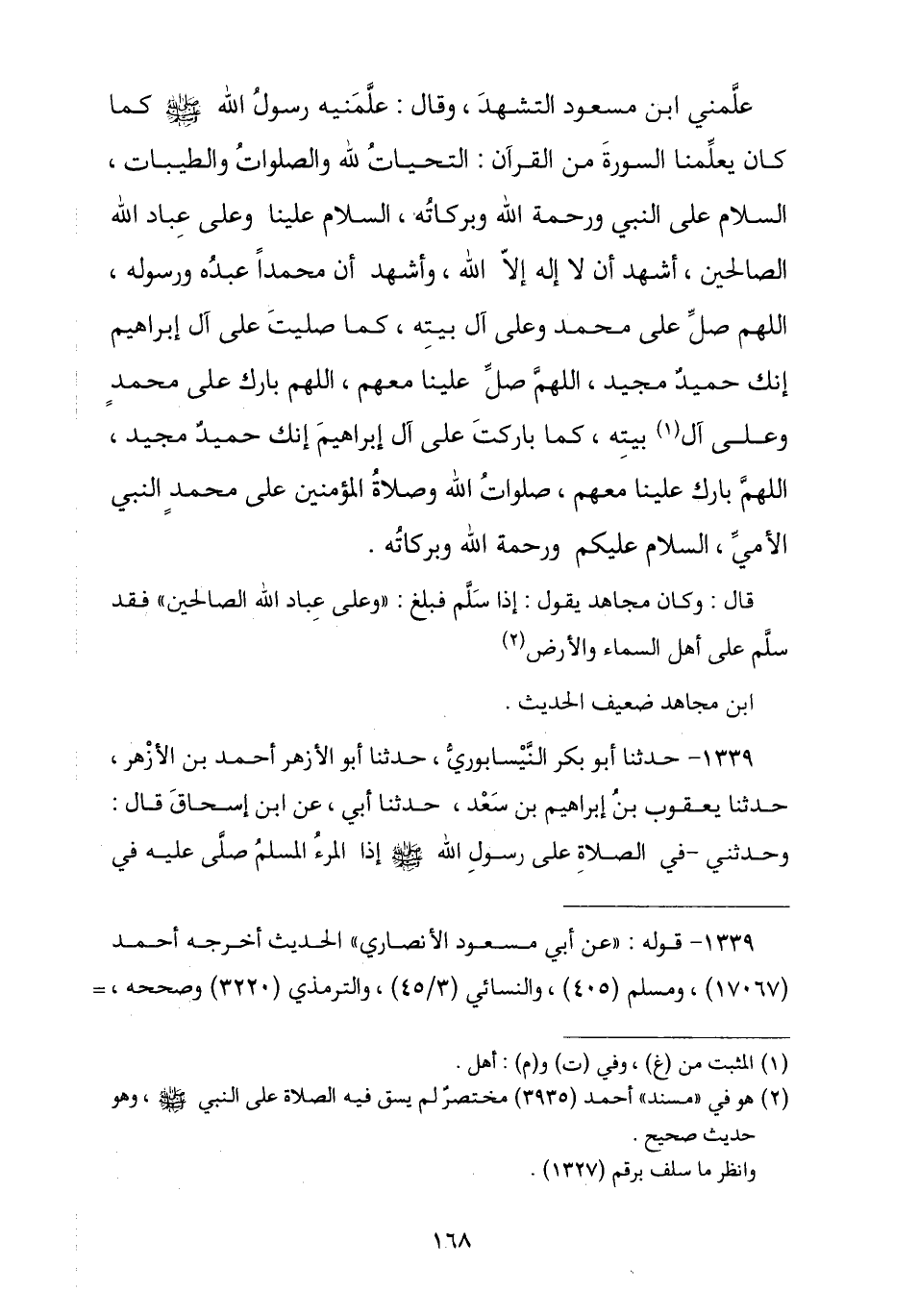 1339 - حَدَّثَنَا أَبُو بَكْرٍ النَّيْسَابُورِيُّ , ثنا أَبُو الْأَزْهَرِ أَحْمَدُ بْنُ الْأَزْهَرِ ثنا يَعْقُوبُ بْنُ إِبْرَاهِيمَ بْنِ سَعْدٍ , ثنا أَبِي , عَنِ ابْنِ إِسْحَاقَ , قَالَ: وَحَدَّثَنِي فِي الصَّلَاةِ عَلَى رَسُولِ اللَّهِ صَلَّى اللهُ عَلَيْهِ وَسَلَّمَ إِذَا الْمَرْءُ الْمُسْلِمُ صَلَّى عَلَيْهِ فِي -[169]- صَلَاتِهِ مُحَمَّدُ بْنُ إِبْرَاهِيمَ بْنِ الْحَارِثِ التَّيْمِيُّ , عَنْ مُحَمَّدِ بْنِ عَبْدِ اللَّهِ بْنِ زَيْدِ بْنِ عَبْدِ رَبِّهِ الْأَنْصَارِيِّ أَخِي بِالْحَارِثِ بْنِ الْخَزْرَجِ , عَنْ أَبِي مَسْعُودٍ الْأَنْصَارِيِّ عُقْبَةَ بْنِ عَمْرٍو قَالَ: أَقْبَلَ رَجُلٌ حَتَّى جَلَسَ بَيْنَ يَدَيْ رَسُولِ اللَّهِ صَلَّى اللهُ عَلَيْهِ وَسَلَّمَ وَنَحْنُ عِنْدَهُ , فَقَالَ: يَا رَسُولَ اللَّهِ أَمَّا السَّلَامُ عَلَيْكَ فَقَدْ عَرَفْنَاهُ , فَكَيْفَ نُصَلِّي عَلَيْكَ إِذَا نَحْنُ صَلَّيْنَا فِي صَلَاتِنَا؟ , قَالَ: فَصَمَتَ رَسُولُ اللَّهِ صَلَّى اللهُ عَلَيْهِ وَسَلَّمَ حَتَّى أَحْبَبْنَا أَنَّ الرَّجُلَ لَمْ يَسْأَلْهُ , ثُمَّ قَالَ: " §إِذَا صَلَّيْتُمْ عَلَيَّ فَقُولُوا: اللَّهُمَّ صَلِّ عَلَى مُحَمَّدٍ النَّبِيِّ الْأُمِّيِّ وَعَلَى آلِ مُحَمَّدٍ , كَمَا صَلَّيْتَ عَلَى إِبْرَاهِيمَ وَعَلَى آلِ إِبْرَاهِيمَ , وَبَارِكْ عَلَى مُحَمَّدٍ النَّبِيِّ الْأُمِّيِّ وَعَلَى آلِ مُحَمَّدٍ , كَمَا بَارَكْتَ عَلَى إِبْرَاهِيمَ وَعَلَى آلِ إِبْرَاهِيمَ إِنَّكَ حَمِيدٌ مَجِيدٌ ". هَذَا إِسْنَادٌ حَسَنٌ مُتَّصِلٌ