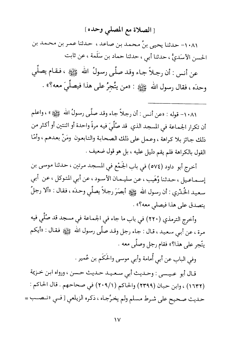 1081 - حَدَّثَنَا يَحْيَى بْنُ مُحَمَّدِ بْنِ صَاعِدٍ , ثنا عُمَرُ بْنُ مُحَمَّدِ بْنِ الْحَسَنِ الْأَسَدِيُّ , ثنا أَبِي , نا حَمَّادُ بْنُ سَلَمَةَ , عَنْ ثَابِتٍ , عَنْ أَنَسٍ: أَنَّ رَجُلًا جَاءَ وَقَدْ صَلَّى رَسُولُ اللَّهِ صَلَّى اللهُ عَلَيْهِ وَسَلَّمَ فَقَامَ يُصَلِّي وَحْدَهُ , فَقَالَ رَسُولُ اللَّهِ صَلَّى اللهُ عَلَيْهِ وَسَلَّمَ: § «مَنْ يَتَّجِرُ عَلَى هَذَا فَلْيُصَلِّي مَعَهُ؟»