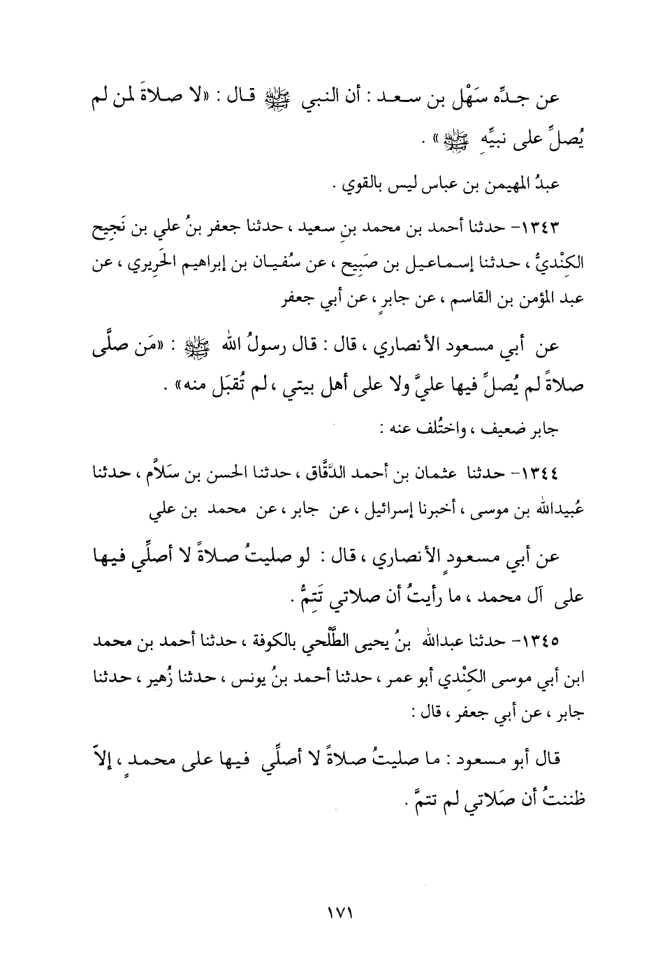 1344 - حَدَّثَنَا عُثْمَانُ بْنُ أَحْمَدَ الدَّقَّاقُ , حَدَّثَنَا الْحَسَنُ بْنُ سَلَّامٍ , ثنا عُبَيْدُ اللَّهِ بْنُ مُوسَى , ثنا إِسْرَائِيلُ , عَنْ جَابِرٍ , عَنْ مُحَمَّدِ بْنِ عَلِيٍّ , عَنْ أَبِي مَسْعُودٍ الْأَنْصَارِيِّ , قَالَ: § «لَوْ صَلَّيْتُ صَلَاةً لَا أُصَلِّي فِيهَا عَلَى آلِ مُحَمَّدٍ مَا رَأَيْتُ أَنَّ صَلَاتِي تَتِمُّ»
