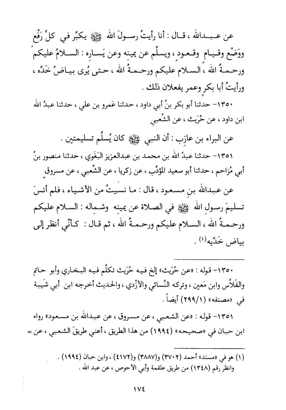1350 - حَدَّثَنَا أَبُو بَكْرِ بْنُ أَبِي دَاوُدَ , ثنا عَمْرُو بْنُ عَلِيٍّ , ثنا عَبْدُ اللَّهِ بْنُ دَاوُدَ , عَنْ حُرَيْثٍ , عَنِ الشَّعْبِيِّ , عَنِ الْبَرَاءِ بْنِ عَازِبٍ , أَنَّ النَّبِيَّ صَلَّى اللهُ عَلَيْهِ وَسَلَّمَ § «كَانَ يُسَلِّمُ تَسْلِيمَتَيْنِ»