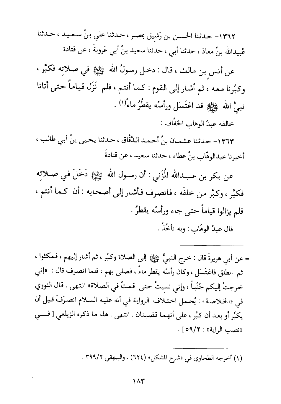 1363 - حَدَّثَنَا عُثْمَانُ بْنُ أَحْمَدَ الدَّقَّاقُ , ثنا يَحْيَى بْنُ أَبِي طَالِبٍ , ثنا عَبْدُ الْوَهَّابِ بْنُ عَطَاءٍ , ثنا سَعِيدٌ , عَنْ قَتَادَةَ , عَنْ بَكْرِ بْنِ عَبْدِ اللَّهِ الْمُزَنِيِّ , أَنَّ رَسُولَ اللَّهِ صَلَّى اللهُ عَلَيْهِ وَسَلَّمَ «دَخَلَ فِي صَلَاتِهِ فَكَبَّرَ وَكَبَّرَ مَنْ خَلْفَهُ , فَانْصَرَفَ فَأَشَارَ إِلَى أَصْحَابِهِ أَيْ كَمَا أَنْتُمْ , §فَلَمْ يَزَالُوا قِيَامًا حَتَّى جَاءَ وَرَأْسُهُ يَقْطُرُ». قَالَ عَبْدُ الْوَهَّابِ: وَبِهِ نَأْخُذُ