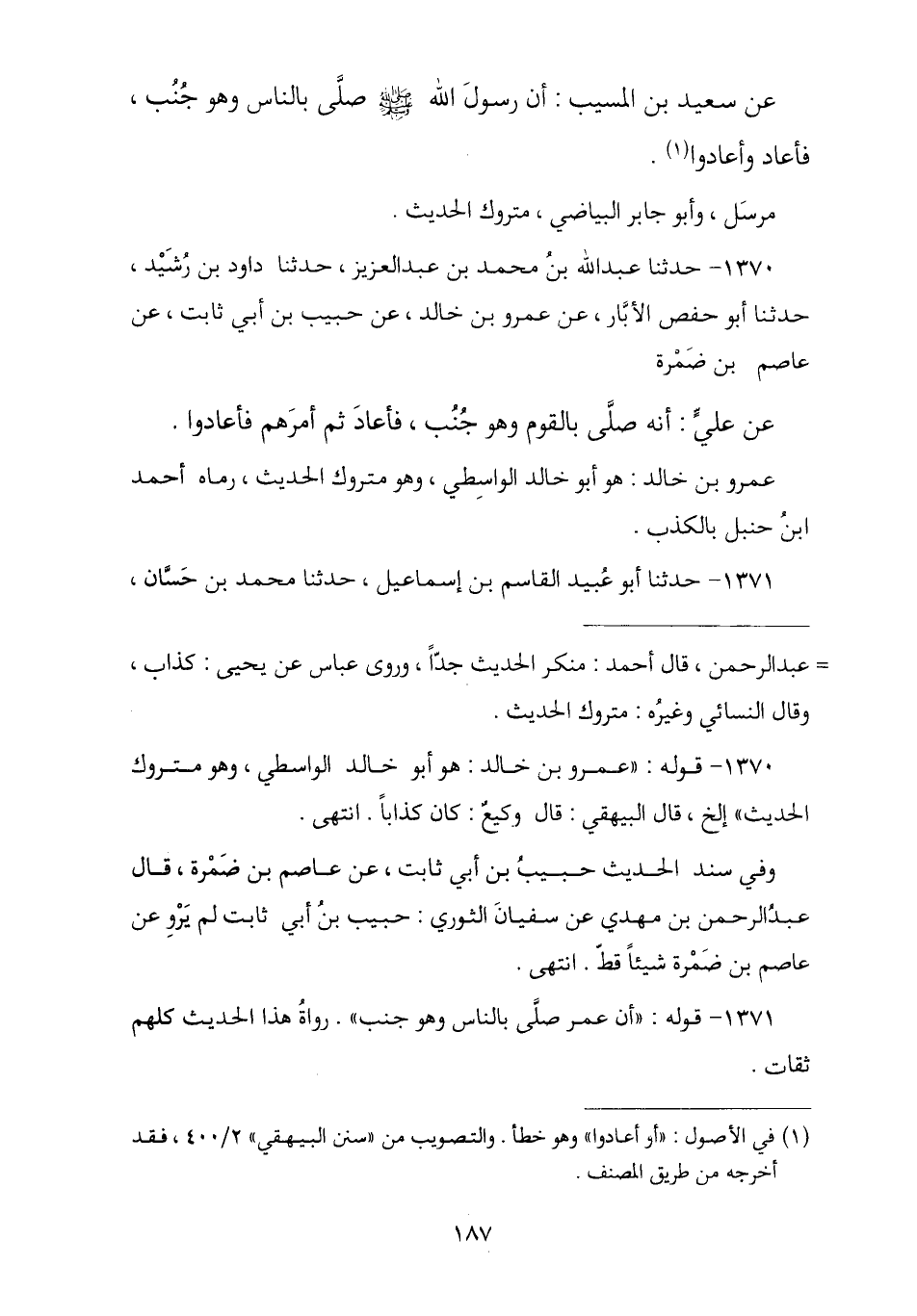 1370 - حَدَّثَنَا عَبْدُ اللَّهِ بْنُ مُحَمَّدِ بْنِ عَبْدِ الْعَزِيزِ , ثنا دَاوُدُ بْنُ رُشَيْدٍ , ثنا أَبُو حَفْصٍ الْأَبَّارُ , عَنْ عَمْرِو بْنِ خَالِدٍ , عَنْ حَبِيبِ بْنِ أَبِي ثَابِتٍ , عَنْ عَاصِمِ بْنِ ضَمْرَةَ , عَنْ عَلِيٍّ , «أَنَّهُ §صَلَّى بِالْقَوْمِ وَهُوَ جُنُبٌ فَأَعَادَ ثُمَّ أَمَرَهُمْ فَأَعَادُوا». عَمْرُو بْنُ خَالِدٍ هُوَ أَبُو خَالِدٍ الْوَاسِطِيُّ وَهُوَ مَتْرُوكُ الْحَدِيثِ رَمَاهُ أَحْمَدُ بْنُ حَنْبَلٍ بِالْكَذِبِ