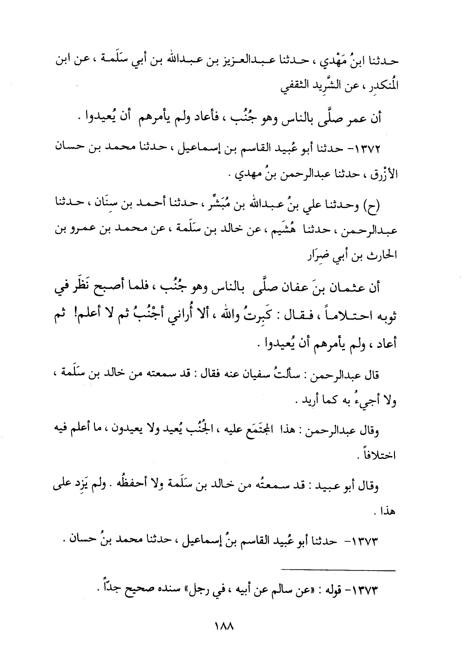 1372 - حَدَّثَنَا أَبُو عُبَيْدٍ الْقَاسِمُ بْنُ إِسْمَاعِيلَ , ثنا مُحَمَّدُ بْنُ حَسَّانَ الْأَزْرَقُ , ثنا عَبْدُ الرَّحْمَنِ بْنُ مَهْدِيٍّ , ح وَحَدَّثَنَا عَلِيُّ بْنُ عَبْدِ اللَّهِ بْنِ مُبَشِّرٍ , ثنا أَحْمَدُ بْنُ سِنَانٍ , ثنا عَبْدُ الرَّحْمَنِ , ثنا هُشَيْمٌ , عَنْ خَالِدِ بْنِ سَلَمَةَ , عَنْ مُحَمَّدِ بْنِ عَمْرِو بْنِ الْحَارِثِ بْنِ أَبِي ضِرَارٍ , أَنَّ عُثْمَانَ بْنَ عَفَّانَ §" صَلَّى بِالنَّاسِ وَهُوَ جُنُبٌ فَلَمَّا أَصْبَحَ نَظَرَ فِي ثَوْبِهِ احْتِلَامًا , فَقَالَ: «كَبِرْتُ وَاللَّهِ أَلَا أَرَانِي أَجْنُبُ ثُمَّ لَا أَعْلَمُ» , ثُمَّ أَعَادَ وَلَمْ يَأْمُرْهُمْ أَنْ يُعِيدُوا. قَالَ عَبْدُ الرَّحْمَنِ: سَأَلْتُ سُفْيَانَ , فَقَالَ: سَمِعْتُهُ مِنْ خَالِدِ بْنِ سَلَمَةَ , وَلَا أَجِيءُ بِهِ كَمَا أُرِيدُ , وَقَالَ عَبْدُ الرَّحْمَنِ: وَهُوَ هَذَا الْمُجْتَمَعُ عَلَيْهِ الْجُنُبُ يُعِيدُ وَلَا يُعِيدُونَ مَا أَعْلَمُ فِيهِ اخْتِلَافًا , وَقَالَ أَبُو عُبَيْدٍ: قَدْ سَمِعْتُهُ مِنْ خَالِدِ بْنِ سَلَمَةَ وَلَا أَحْفَظُهُ وَلَمْ يَزِدْ عَلَى هَذَا