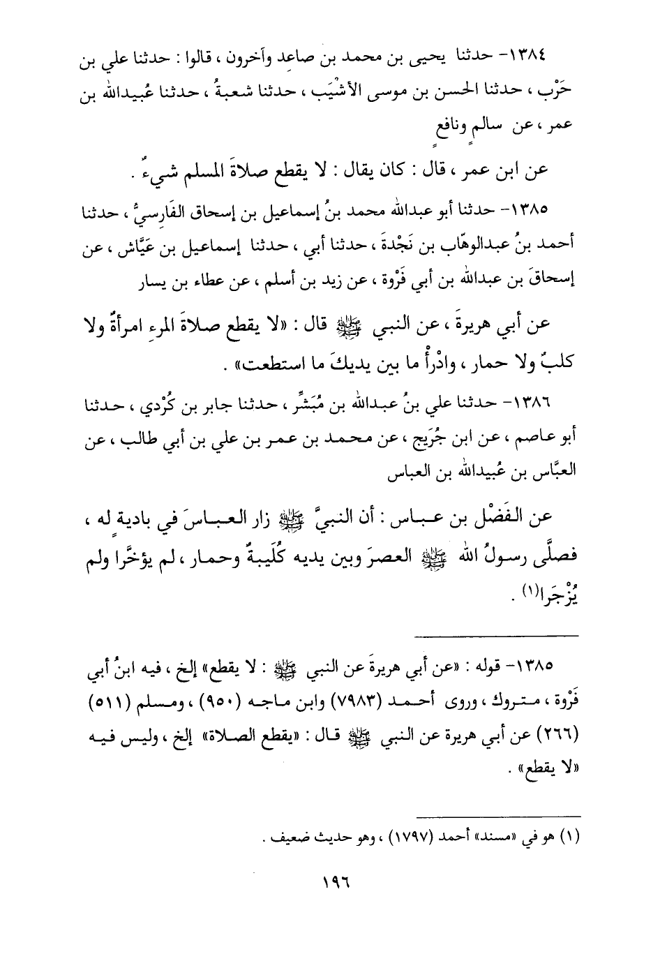 1384 - حَدَّثَنَا يَحْيَى بْنُ مُحَمَّدِ بْنِ صَاعِدٍ وَآخَرُونَ , قَالُوا: حَدَّثَنَا عَلِيُّ بْنُ حَرْبٍ , ثنا الْحَسَنُ بْنُ مُوسَى الْأَشْيَبُ , حَدَّثَنَا شُعْبَةُ , ثنا عُبَيْدُ اللَّهِ بْنُ عُمَرَ , عَنْ سَالِمٍ , وَنَافِعٍ , عَنِ ابْنِ عُمَرَ , قَالَ: «كَانَ يُقَالُ §لَا يَقْطَعُ صَلَاةَ الْمُسْلِمِ شَيْءٌ»