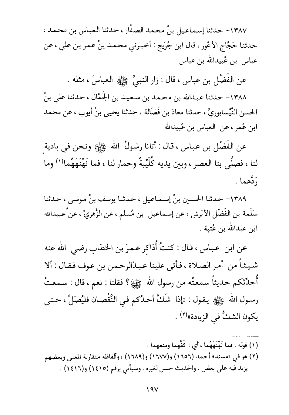 1389 - حَدَّثَنَا الْحُسَيْنُ بْنُ إِسْمَاعِيلَ , ثنا يُوسُفُ بْنُ مُوسَى , ثنا سَلَمَةُ بْنُ الْفَضْلِ الْأَبْرَشُ , عَنْ إِسْمَاعِيلَ بْنِ مُسْلِمٍ , عَنِ الزُّهْرِيِّ , عَنْ عُبَيْدِ اللَّهِ بْنِ عَبْدِ اللَّهِ بْنِ عُتْبَةَ , عَنِ ابْنِ عَبَّاسٍ , ذَكَرَ عُمَرُ بْنُ الْخَطَّابِ شَيْئًا مِنْ أَمْرِ الصَّلَاةِ فَأَتَى عَبْدُ الرَّحْمَنِ بْنُ عَوْفٍ , فَقَالَ: أَلَا أُحَدِّثُكُمْ حَدِيثًا سَمِعْتُهُ مِنْ رَسُولِ اللَّهِ صَلَّى اللهُ عَلَيْهِ وَسَلَّمَ؟ فَقُلْنَا: نَعَمْ , قَالَ: سَمِعْتُ رَسُولَ اللَّهِ صَلَّى اللهُ عَلَيْهِ وَسَلَّمَ يَقُولُ: § «إِذَا شَكَّ أَحَدُكُمْ فِي النُّقْصَانِ فَلْيُصَلِّ حَتَّى يَكُونَ الشَّكُّ فِي الزِّيَادَةِ»