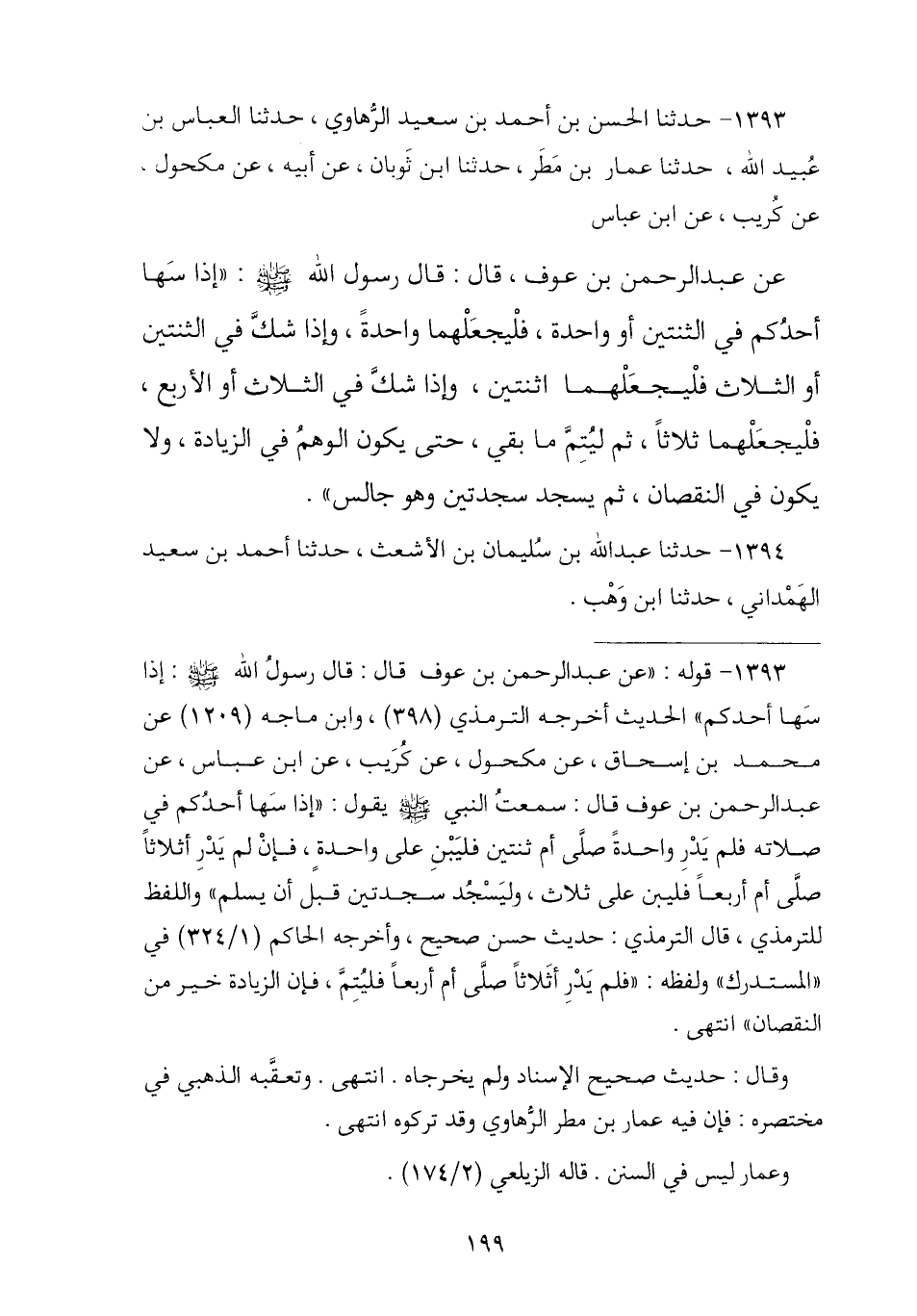 1393 - حَدَّثَنَا الْحَسَنُ بْنُ أَحْمَدَ بْنِ سَعِيدٍ الرَّهَاوِيُّ , ثنا الْعَبَّاسُ بْنُ عُبَيْدِ اللَّهِ , ثنا عَمَّارُ بْنُ مَطَرٍ , ثنا ابْنُ ثَوْبَانَ , عَنْ أَبِيهِ , عَنْ مَكْحُولٍ , عَنْ كُرَيْبٍ , عَنِ ابْنِ عَبَّاسٍ , عَنْ عَبْدِ الرَّحْمَنِ بْنِ عَوْفٍ , قَالَ: قَالَ رَسُولُ اللَّهِ صَلَّى اللهُ عَلَيْهِ وَسَلَّمَ: § «إِذَا سَهَى أَحَدُكُمْ فِي الثِّنْتَيْنِ أَوِ الْوَاحِدَةِ فَلْيَجْعَلْهُمَا وَاحِدَةً , وَإِذَا شَكَّ فِي الثِّنْتَيْنِ أَوِ الثَّلَاثِ فَلْيَجْعَلْهُمَا اثْنَتَيْنِ , وَإِذَا شَكَّ فِي الثَّلَاثِ أَوِ الْأَرْبَعِ فَلْيَجْعَلْهُمَا ثَلَاثًا , ثُمَّ لِيُتِمَّ مَا بَقِيَ حَتَّى يَكُونَ الْوَهْمُ فِي الزِّيَادَةِ وَلَا يَكُونَ فِي النُّقْصَانِ , ثُمَّ يَسْجُدُ سَجْدَتَيْنِ وَهُوَ جَالِسٌ»