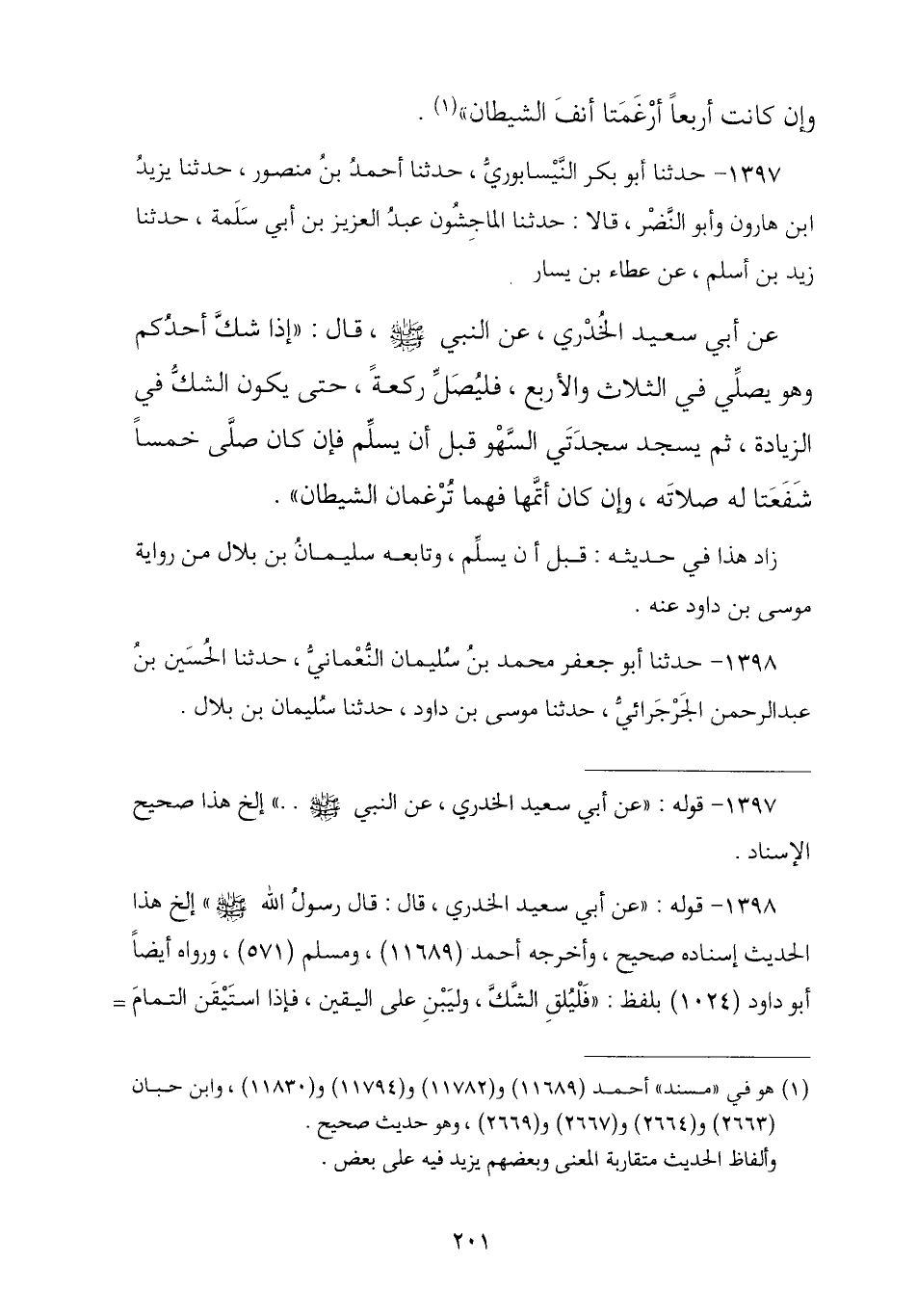 1398 - حَدَّثَنَا أَبُو جَعْفَرٍ مُحَمَّدُ بْنُ سُلَيْمَانَ النُّعْمَانِيُّ , ثنا الْحُسَيْنُ بْنُ عَبْدِ الرَّحْمَنِ الْجَرْجَرَائِيُّ , ثنا مُوسَى بْنُ دَاوُدَ , ثنا سُلَيْمَانُ بْنُ بِلَالٍ , -[202]- ح وَحَدَّثَنَا أَبُو بَكْرٍ النَّيْسَابُورِيُّ , ثنا الْعَبَّاسُ بْنُ مُحَمَّدٍ , ثنا مُوسَى بْنُ دَاوُدَ , ثنا سُلَيْمَانُ بْنُ بِلَالٍ , عَنْ زَيْدِ بْنِ أَسْلَمَ , عَنْ عَطَاءِ بْنِ يَسَارٍ , عَنْ أَبِي سَعِيدٍ الْخُدْرِيِّ , قَالَ: قَالَ رَسُولُ اللَّهِ صَلَّى اللهُ عَلَيْهِ وَسَلَّمَ: § «إِذَا شَكَّ أَحَدُكُمْ فِي صَلَاتِهِ فَلَمْ يَدْرِ كَمْ صَلَّى ثَلَاثًا أَمْ أَرْبَعًا فَلْيَطْرَحِ الشَّكَّ وَلْيَبْنِ عَلَى مَا اسْتَيْقَنَ , ثُمَّ يَسْجُدُ سَجْدَتَيْنِ قَبْلَ أَنْ يُسَلِّمَ , فَإِنْ كَانَ صَلَّى خَمْسًا كَانَتَا شَفْعًا لِصَلَاتِهِ , وَإِنْ كَانَ صَلَّى تَمَامَ الْأَرْبَعِ كَانَتَا تَرْغِيمًا لِلشَّيْطَانِ»
