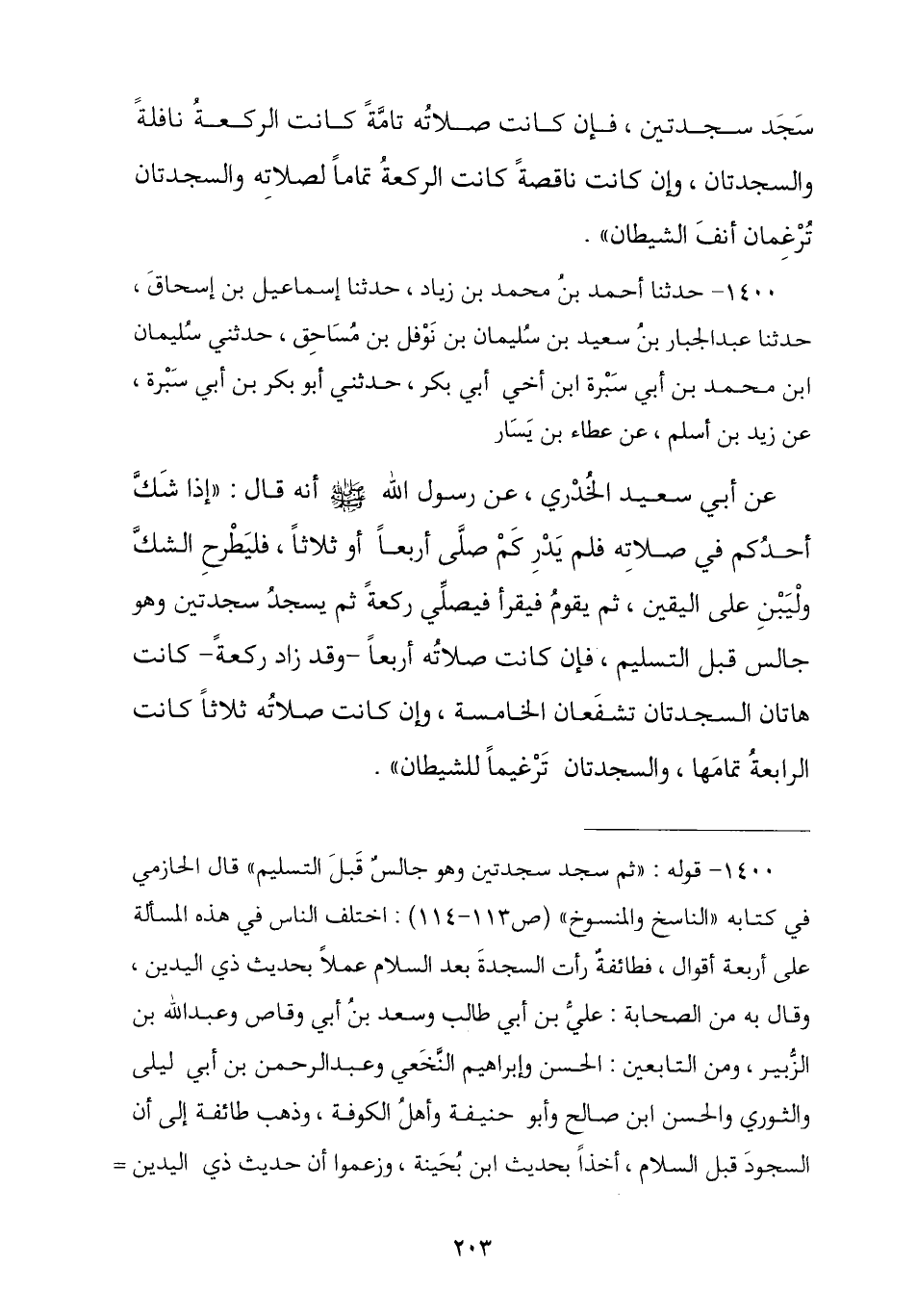 1400 - حَدَّثَنَا أَحْمَدُ بْنُ مُحَمَّدِ بْنِ زِيَادٍ , ثنا إِسْمَاعِيلُ بْنُ إِسْحَاقَ , ثنا عَبْدُ الْجَبَّارِ بْنُ سَعِيدِ بْنِ سُلَيْمَانَ بْنِ نَوْفَلِ بْنِ مُسَاحِقٍ , حَدَّثَنِي سُلَيْمَانُ بْنُ مُحَمَّدِ بْنِ أَبِي سَبْرَةَ ابْنِ أَخِي أَبِي بَكْرٍ , حَدَّثَنِي أَبُو بَكْرِ بْنُ أَبِي سَبْرَةَ , عَنْ زَيْدِ بْنِ أَسْلَمَ , عَنْ عَطَاءِ بْنِ يَسَارٍ , عَنْ أَبِي سَعِيدٍ الْخُدْرِيِّ , عَنْ رَسُولِ اللَّهِ صَلَّى اللهُ عَلَيْهِ وَسَلَّمَ أَنَّهُ قَالَ: § «إِذَا شَكَّ أَحَدُكُمْ فِي صَلَاتِهِ فَلَمْ يَدْرِ كَمْ صَلَّى أَرْبَعًا أَوْ ثَلَاثًا فَلْيَطْرَحِ الشَّكَّ وَلْيَبْنِ عَلَى الْيَقِينِ , ثُمَّ لِيَقُمْ فَيُصَلِّي رَكْعَةً ثُمَّ سَجَدَ سَجْدَتَيْنِ وَهُوَ جَالِسٌ قَبْلَ التَّسْلِيمِ , فَإِنْ كَانَتْ صَلَاتُهُ أَرْبَعًا وَقَدْ زَادَ رَكْعَةً كَانَتْ هَاتَانِ السَّجْدَتَانِ تُشْفِعَانِ الْخَامِسَةَ , وَإِنْ كَانَتْ صَلَاتُهُ ثَلَاثًا كَانَتِ الرَّابِعَةُ تَمَامَهَا وَالسَّجْدَتَانِ تَرْغِيمًا لِلشَّيْطَانِ»