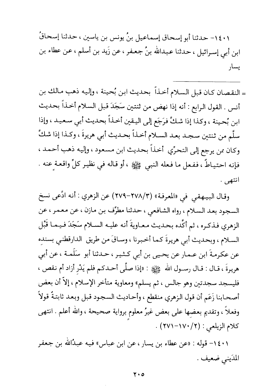 1401 - حَدَّثَنَا أَبُو إِسْحَاقَ إِسْمَاعِيلُ بْنُ يُونُسَ بْنِ يَاسِينَ , ثنا إِسْحَاقُ بْنُ أَبِي إِسْرَائِيلَ , ثنا عَبْدُ اللَّهِ بْنُ جَعْفَرٍ , عَنْ زَيْدِ بْنِ أَسْلَمَ , عَنْ عَطَاءِ بْنِ يَسَارٍ , -[206]- عَنِ ابْنِ عَبَّاسٍ , قَالَ: قَالَ رَسُولُ اللَّهِ صَلَّى اللهُ عَلَيْهِ وَسَلَّمَ: § «إِذَا شَكَّ أَحَدُكُمْ فِي صَلَاتِهِ فَإِنِ اسْتَيْقَنَ أَنَّهُ قَدْ صَلَّى ثَلَاثًا فَلْيُصَلِّ وَاحِدَةً بِرَكْعَتِهَا وَسَجْدَتَيْهَا , ثُمَّ لِيَتَشَهَّدْ فَإِذَا فَرَغَ فَلَمْ يَبْقَ إِلَّا أَنْ يُسَلِّمَ فَلْيَسْجُدْ سَجْدَتَيْنِ وَهُوَ جَالِسٌ ثُمَّ يُسَلِّمُ , فَإِنْ كَانَ صَلَّى ثَلَاثًا وَكَانَتِ الرَّكْعَةُ الَّتِي صَلَّى رَابِعَةً كَانَتِ السَّجْدَتَانِ تَرْغِيمًا لِلشَّيْطَانِ , وَإِنْ كَانَ صَلَّى أَرْبَعًا وَكَانَتِ الرَّكْعَةُ الَّتِي صَلَّى خَامِسَةً شَفَعَهَا بِسَجْدَتَيْنِ»