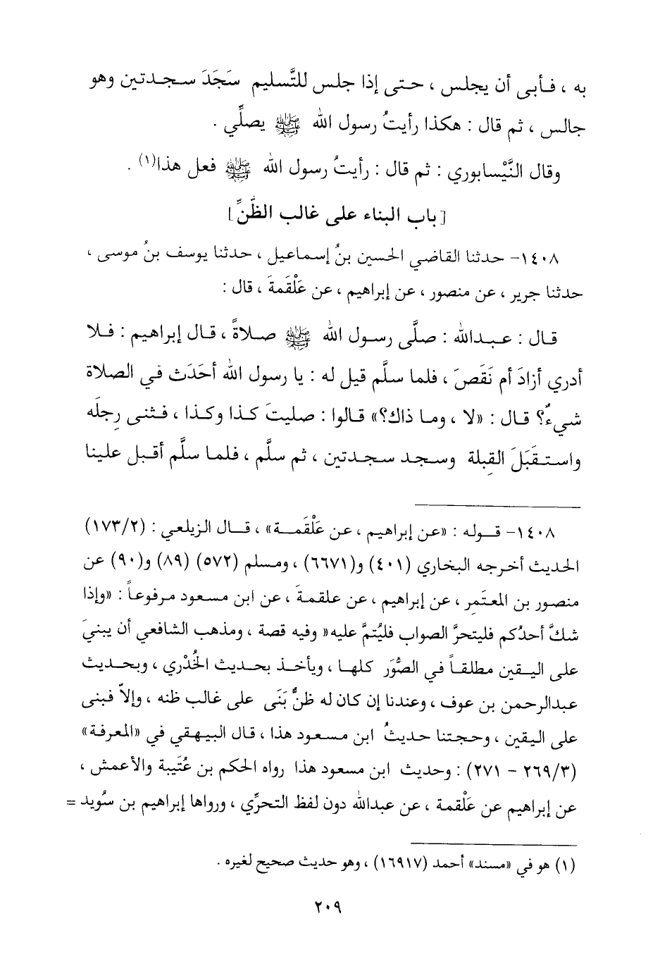 1408 - حَدَّثَنَا الْقَاضِي الْحُسَيْنُ بْنُ إِسْمَاعِيلَ , ثنا يُوسُفُ بْنُ مُوسَى , ثنا جَرِيرٌ , عَنْ مَنْصُورٍ , عَنْ إِبْرَاهِيمَ , عَنْ عَلْقَمَةَ , قَالَ: قَالَ عَبْدُ اللَّهِ: صَلَّى رَسُولُ اللَّهِ صَلَّى اللهُ عَلَيْهِ وَسَلَّمَ صَلَاةً - قَالَ إِبْرَاهِيمُ: - فَلَا أَدْرِي أَزَادَ أَمْ نَقَصَ , فَلَمَّا سَلَّمَ قِيلَ لَهُ: يَا رَسُولَ اللَّهِ أَحَدَثَ فِي الصَّلَاةِ شَيْءٌ؟ , قَالَ: «لَا وَمَا ذَلِكَ؟» , قَالُوا: صَلَّيْتَ كَذَا , فَثَنَى رِجْلَيْهِ وَاسْتَقْبَلَ الْقِبْلَةَ وَسَجَدَ سَجْدَتَيْنِ ثُمَّ سَلَّمَ , فَلَمَّا سَلَّمَ أَقْبَلَ عَلَيْنَا -[210]- بِوَجْهِهِ , فَقَالَ: «إِنَّهُ لَوْ حَدَثَ فِي الصَّلَاةِ شَيْءٌ أَنْبَأْتُكُمُوهُ وَلَكِنْ إِنَّمَا أَنَا بَشَرٌ أَنْسَى كَمَا تَنْسَوْنَ فَإِذَا نَسِيتُ فَذَكِّرُونِي , §وَإِذَا شَكَّ أَحَدُكُمْ فِي صَلَاتِهِ فَلْيَتَحَرَّ الصَّوَابَ , ثُمَّ يُتِمُّ عَلَيْهِ ثُمَّ يُسَلِّمُ ثُمَّ يَسْجُدُ سَجْدَتَيْنِ»