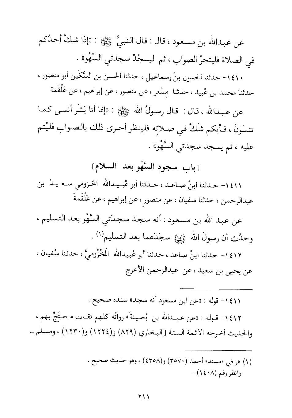 1411 - حَدَّثَنَا ابْنُ صَاعِدٍ , ثنا أَبُو عُبَيْدِ اللَّهِ الْمَخْزُومِيُّ سَعِيدُ بْنُ عَبْدِ الرَّحْمَنِ , ثنا سُفْيَانُ , عَنْ مَنْصُورٍ , عَنْ إِبْرَاهِيمَ , عَنْ عَلْقَمَةَ , عَنِ ابْنِ مَسْعُودٍ , «أَنَّهُ §سَجَدَ سَجْدَتَيِ السَّهْوِ بَعْدَ التَّسْلِيمِ وَحَدَّثَ أَنَّ رَسُولَ اللَّهِ صَلَّى اللهُ عَلَيْهِ وَسَلَّمَ سَجَدَهُمَا بَعْدَ التَّسْلِيمِ»