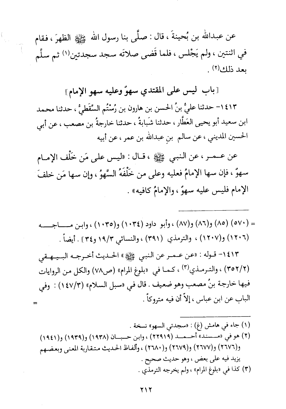 1413 - حَدَّثَنَا عَلِيُّ بْنُ الْحَسَنِ بْنِ هَارُونَ بْنِ رُسْتُمَ الْسَقَطِيُّ , ثنا مُحَمَّدُ بْنُ سَعِيدٍ أَبُو يَحْيَى الْعَطَّارُ , ثنا شَبَابَةُ , ثنا خَارِجَةُ بْنُ مُصْعَبٍ , عَنْ أَبِي الْحُسَيْنِ الْمَدِينِيِّ , عَنْ سَالِمِ بْنِ عَبْدِ اللَّهِ بْنِ عُمَرَ , عَنْ أَبِيهِ , عَنْ عُمَرَ , عَنِ النَّبِيِّ صَلَّى اللهُ عَلَيْهِ وَسَلَّمَ قَالَ: § «لَيْسَ عَلَى مَنْ خَلْفَ الْإِمَامِ سَهْوٌ , فَإِنْ سَهَا الْإِمَامُ فَعَلَيْهِ وَعَلَى مَنْ خَلْفَهُ السَّهْوُ , وَإِنْ سَهَا مَنْ خَلْفَ الْإِمَامِ فَلَيْسَ عَلَيْهِ سَهْوٌ وَالْإِمَامُ كَافِيهِ»