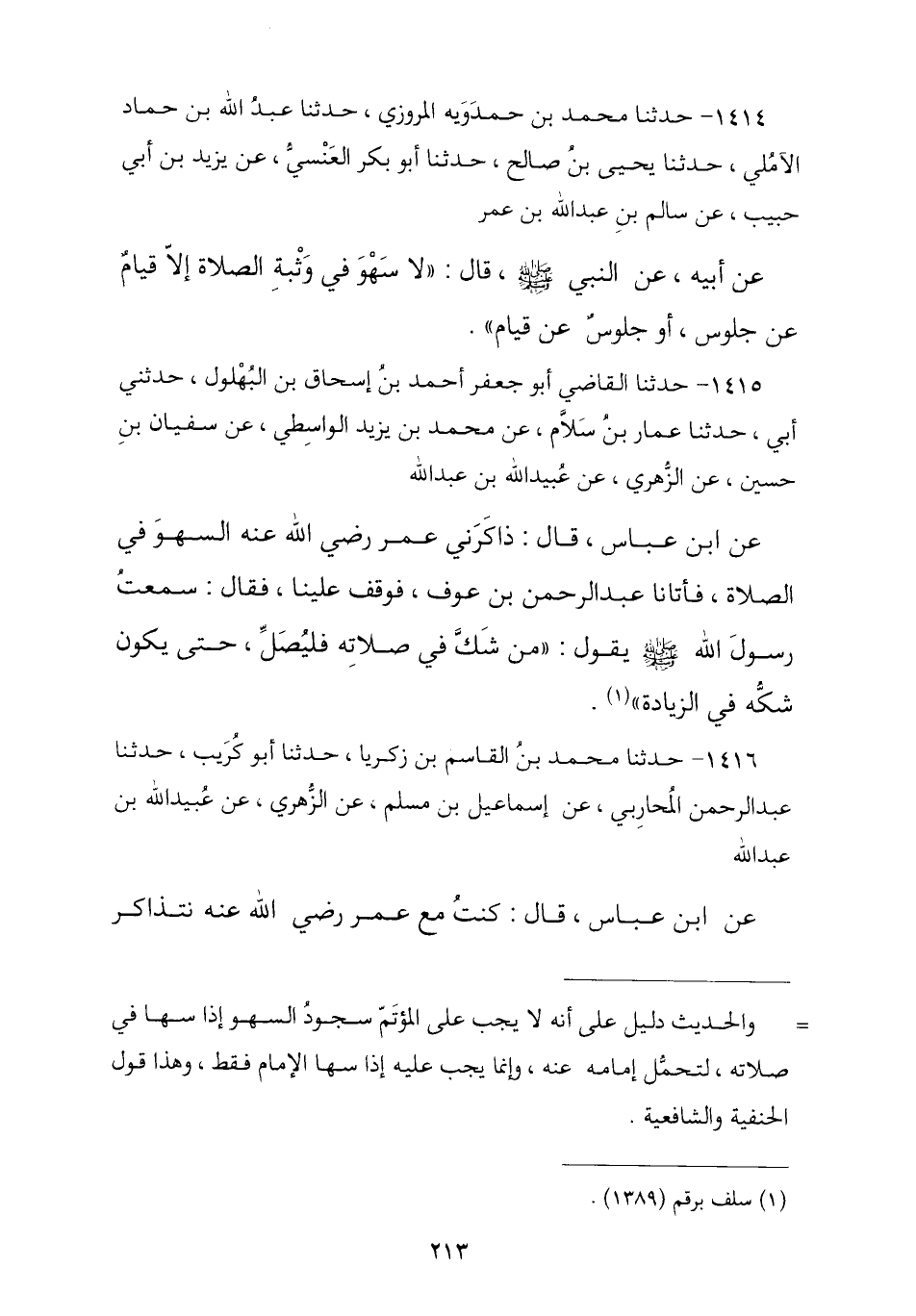 1414 - حَدَّثَنَا مُحَمَّدُ بْنُ حَمْدَوَيْهِ الْمَرْوَزِيُّ , ثنا عَبْدُ اللَّهِ بْنُ حَمَّادٍ الْآمُلِيُّ , ثنا يَحْيَى بْنُ صَالِحٍ , ثنا أَبُو بَكْرٍ الْعَبْسِيُّ , عَنْ يَزِيدَ بْنِ أَبِي حَبِيبٍ , عَنْ سَالِمِ بْنِ عَبْدِ اللَّهِ بْنِ عُمَرَ , عَنْ أَبِيهِ , عَنِ النَّبِيِّ صَلَّى اللهُ عَلَيْهِ وَسَلَّمَ قَالَ: § «لَا سَهْوَ فِي وَثْبَةِ الصَّلَاةِ إِلَّا قِيَامٌ عَنْ جُلُوسٍ أَوْ جُلُوسٌ عَنْ قِيَامٍ»