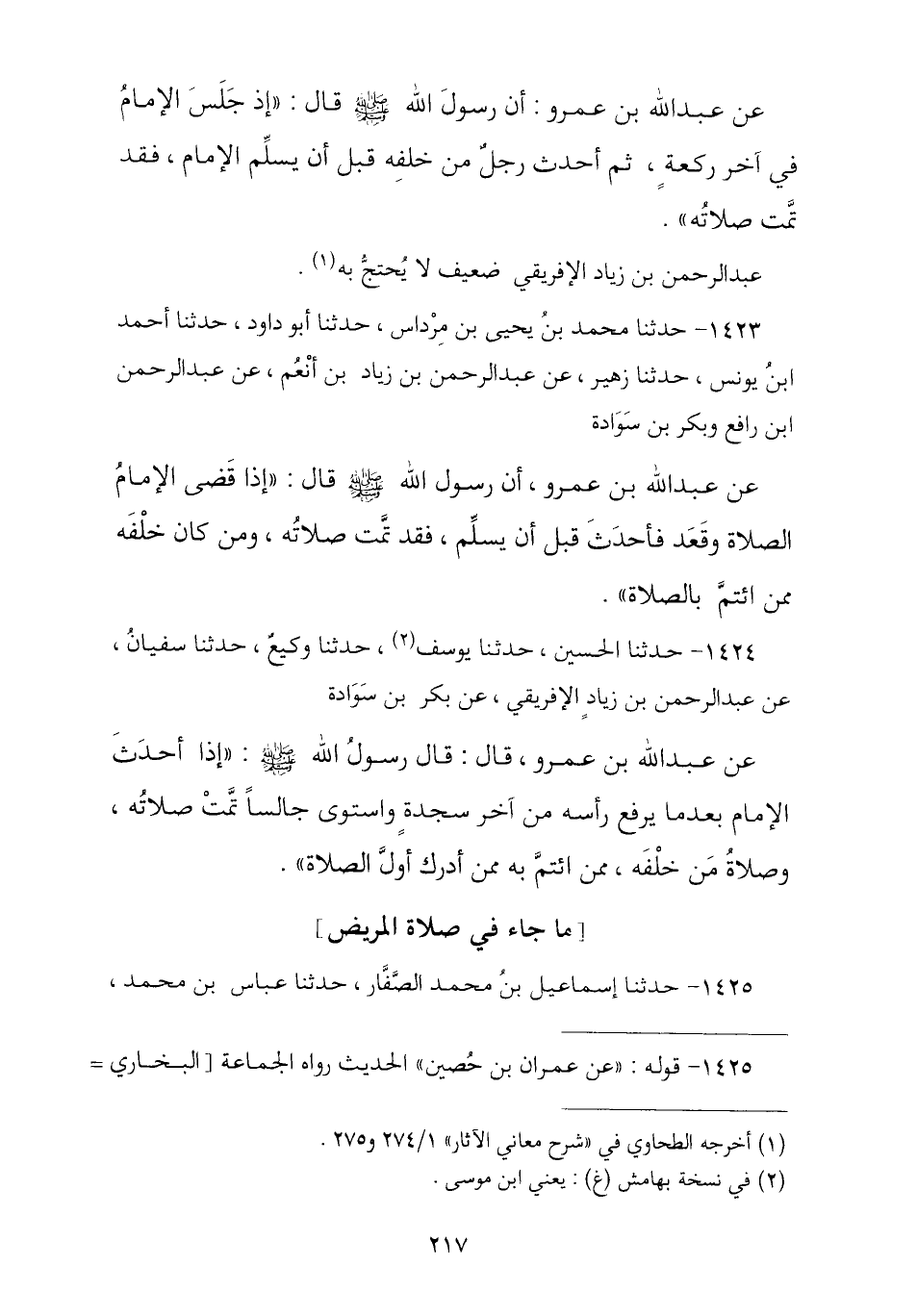 1424 - حَدَّثَنَا الْحُسَيْنُ , ثنا يُوسُفُ يَعْنِي ابْنَ مُوسَى , ثنا وَكِيعٌ , ثنا سُفْيَانُ , عَنْ عَبْدِ الرَّحْمَنِ بْنِ زِيَادٍ , عَنْ بَكْرِ بْنِ سَوَادَةَ , عَنْ عَبْدِ اللَّهِ بْنِ عَمْرٍو , قَالَ: قَالَ رَسُولُ اللَّهِ صَلَّى اللهُ عَلَيْهِ وَسَلَّمَ: § «إِذَا أَحْدَثَ الْإِمَامُ بَعْدَمَا يَرْفَعُ رَأْسَهُ مِنْ آخِرِ سَجْدَةٍ وَاسْتَوَى جَالِسًا تَمَّتْ صَلَاتُهُ وَصَلَاةُ مَنْ خَلْفَهُ مِمَّنِ ائْتَمَّ بِهِ مِمَّنْ أَدْرَكَ أَوَّلَ الصَّلَاةِ»