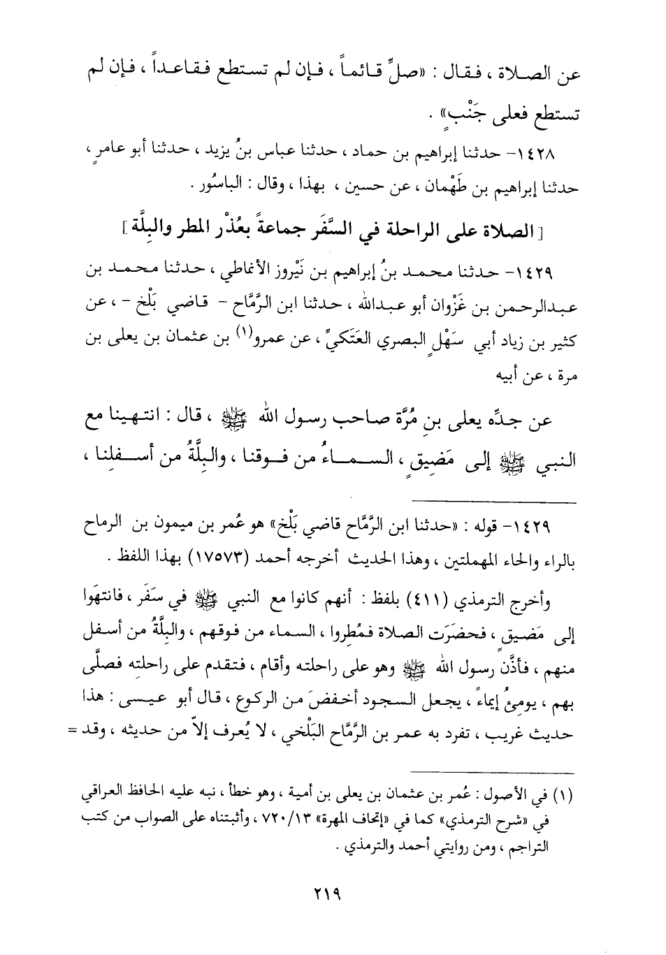 1429 - حَدَّثَنَا مُحَمَّدُ بْنُ إِبْرَاهِيمَ بْنِ نَيْرُوزٍ الْأَنْمَاطِيُّ , ثنا مُحَمَّدُ بْنُ عَبْدِ الرَّحْمَنِ بْنِ غَزْوَانَ أَبُو عَبْدِ اللَّهِ , ثنا ابْنُ الرَّمَّاحِ قَاضِي بَلْخَ , عَنْ كَثِيرِ بْنِ زِيَادٍ أَبِي سَهْلٍ الْبَصْرِيِّ الْعَتَكِيِّ , عَنْ عَمْرِو بْنِ عُثْمَانَ بْنِ يَعْلَى بْنِ أُمَيَّةَ , عَنْ أَبِيهِ , عَنْ جَدِّهِ يَعْلَى بْنِ أُمَيَّةَ صَاحِبِ رَسُولِ اللَّهِ صَلَّى اللهُ عَلَيْهِ وَسَلَّمَ , قَالَ: «انْتَهَيْنَا مَعَ النَّبِيِّ صَلَّى اللهُ عَلَيْهِ وَسَلَّمَ إِلَى مَضِيقٍ , السَّمَاءُ مِنْ فَوْقِنَا وَالْبِلَّةُ مِنْ أَسْفَلِنَا , -[220]- وَحَضَرَتِ الصَّلَاةُ فَأَمَرَ الْمُؤَذِّنَ فَأَذَّنَ وَأَقَامَ أَوْ أَقَامَ بِغَيْرِ أَذَانٍ , ثُمَّ تَقَدَّمَ النَّبِيُّ صَلَّى اللهُ عَلَيْهِ وَسَلَّمَ §فَصَلَّى بِنَا عَلَى رَاحِلَتِهِ وَصَلَّيْنَا خَلْفَهُ عَلَى رَوَاحِلِنَا , وَجَعَلَ سُجُودَهُ أَخْفَضَ مِنْ رُكُوعِهِ»