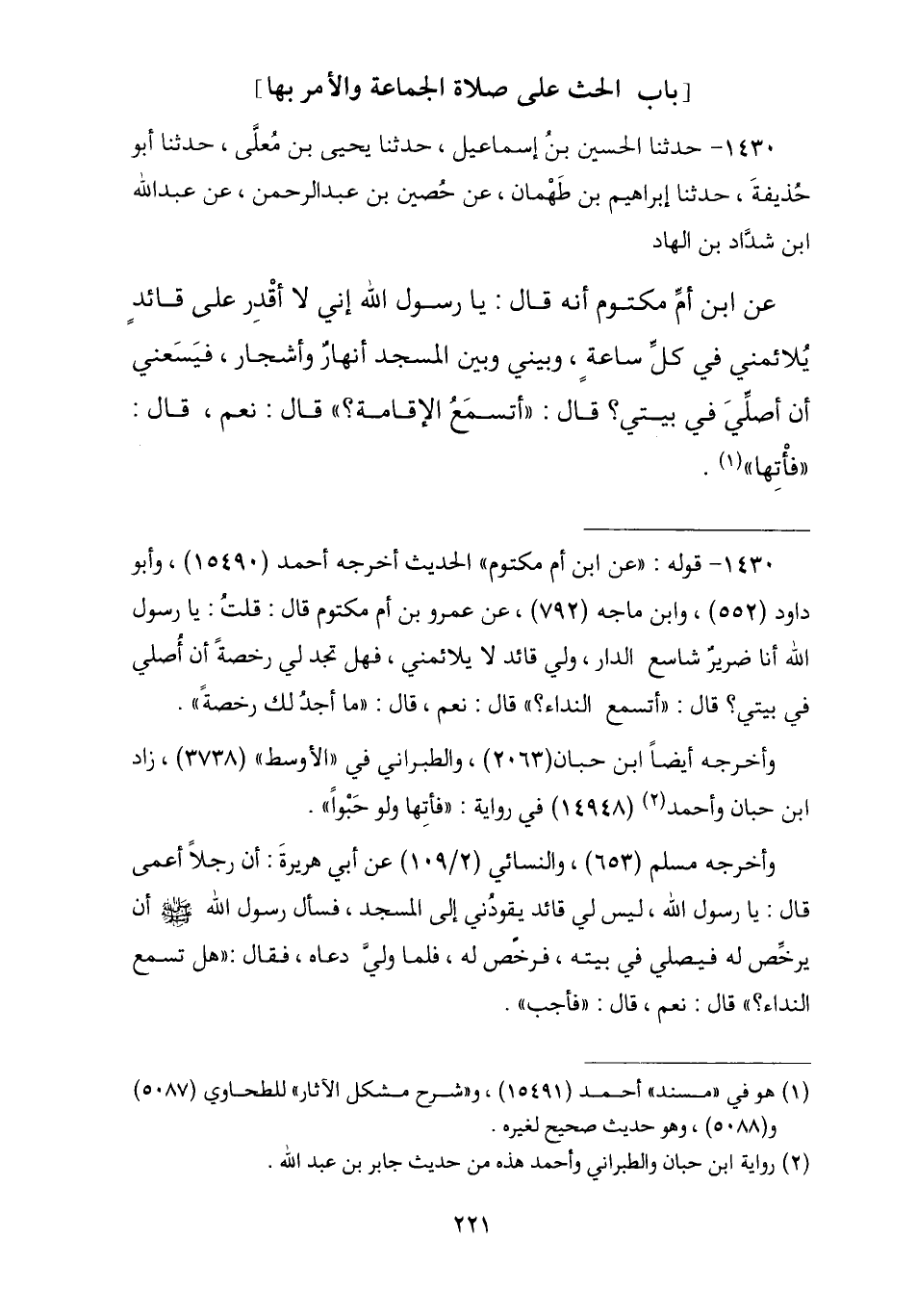 1430 - وَحَدَّثَنَا الْحُسَيْنُ بْنُ إِسْمَاعِيلَ , ثنا يَحْيَى بْنُ مُعَلَّى , ثنا أَبُو حُذَيْفَةَ , ثنا إِبْرَاهِيمُ بْنُ طَهْمَانَ , عَنْ حُصَيْنِ بْنِ عَبْدِ الرَّحْمَنِ , عَنْ عَبْدِ اللَّهِ بْنِ شَدَّادِ بْنِ الْهَادِ , عَنِ ابْنِ أُمِّ مَكْتُومٍ , أَنَّهُ قَالَ: يَا رَسُولَ اللَّهِ إِنِّي لَا أَقْدِرُ عَلَى قَائِدٍ يُلَائِمُنِي فِي كُلِّ سَاعَةٍ وَبَيْنِي وَبَيْنَ الْمَسْجِدِ أَنْهَارٌ وَأَشْجَارٌ فَيَسَعُنِي أَنْ أُصَلِّيَ فِي بَيْتِي , قَالَ: «§أَتَسْمَعُ الْإِقَامَةَ؟» , قَالَ: نَعَمْ , قَالَ: «فَأْتِهَا»