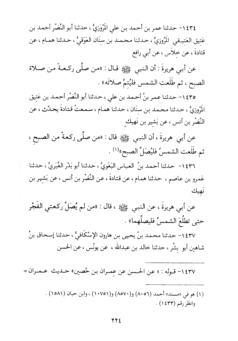 1434 - حَدَّثَنَا عُمَرُ بْنُ أَحْمَدَ بْنِ عَلِيٍّ الْمَرْوَزِيُّ , ثنا أَبُو النَّضْرِ أَحْمَدُ بْنُ عَتِيقٍ الْعَتِيقِيُّ الْمَرْوَزِيُّ , ثنا مُحَمَّدُ بْنُ سِنَانٍ الْعَوَقِيُّ , ثنا هَمَّامٌ , عَنْ قَتَادَةَ , عَنْ خِلَاسٍ , عَنْ أَبِي رَافِعٍ , عَنْ أَبِي هُرَيْرَةَ , أَنَّ النَّبِيَّ صَلَّى اللهُ عَلَيْهِ وَسَلَّمَ قَالَ: § «مَنْ صَلَّى رَكْعَةً مِنْ صَلَاةِ الصُّبْحِ ثُمَّ طَلَعَتِ الشَّمْسُ فَلْيُتِمَّ صَلَاتَهُ»