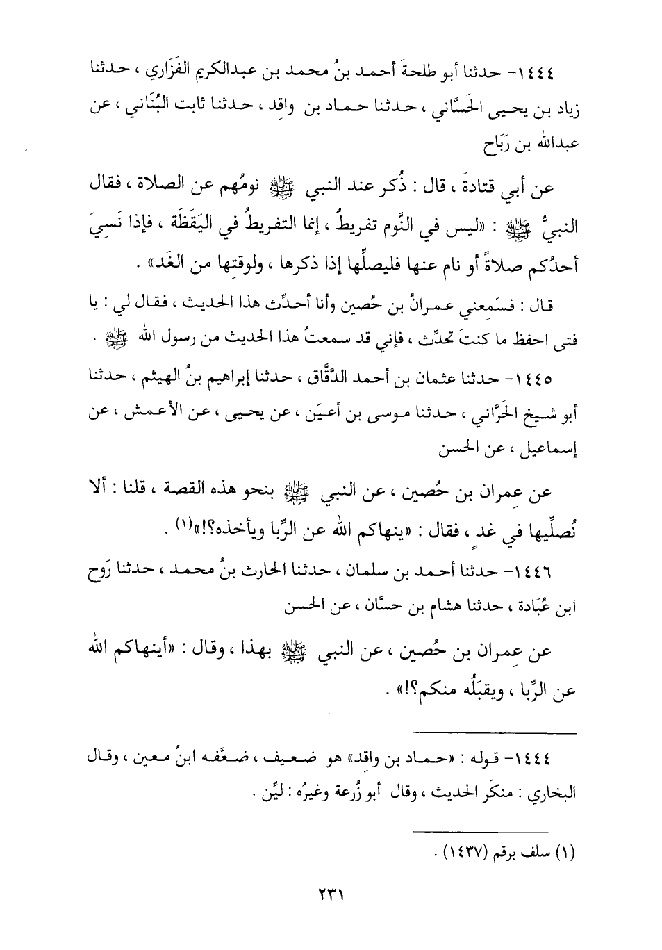 1444 - حَدَّثَنَا أَبُو طَلْحَةَ أَحْمَدُ بْنُ مُحَمَّدِ بْنِ عَبْدِ الْكَرِيمِ الْفَزَارِيُّ , ثنا زِيَادُ بْنُ يَحْيَى الْحَسَّانِيُّ , ثنا حَمَّادُ بْنُ وَاقِدٍ , ثنا ثَابِتٌ الْبُنَانِيُّ , عَنْ عَبْدِ اللَّهِ بْنِ رَبَاحٍ , عَنْ أَبِي قَتَادَةَ , قَالَ: ذُكِرَ عِنْدَ النَّبِيِّ صَلَّى اللهُ عَلَيْهِ وَسَلَّمَ نَوْمُهُمْ عَنِ الصَّلَاةِ , فَقَالَ رَسُولُ اللَّهِ صَلَّى اللهُ عَلَيْهِ وَسَلَّمَ: § «لَيْسَ فِي النَّوْمِ تَفْرِيطٌ إِنَّمَا التَّفْرِيطُ فِي الْيَقَظَةِ , فَإِذَا نَسِيَ أَحَدُكُمْ صَلَاةً أَوْ نَامَ عَنْهَا فَلْيُصَلِّهَا إِذَا ذَكَرَهَا وَلِوَقْتِهَا مِنَ الْغَدِ». قَالَ: فَسَمِعَنِي عِمْرَانُ بْنُ حُصَيْنٍ وَأَنَا أُحَدِّثُ هَذَا الْحَدِيثَ , فَقَالَ لِي: يَا فَتًى احْفَظْهَا كُنْتَ تُحَدِّثُ فَإِنِّي قَدْ سَمِعْتُ هَذَا الْحَدِيثَ مِنْ رَسُولِ اللَّهِ صَلَّى اللهُ عَلَيْهِ وَسَلَّمَ