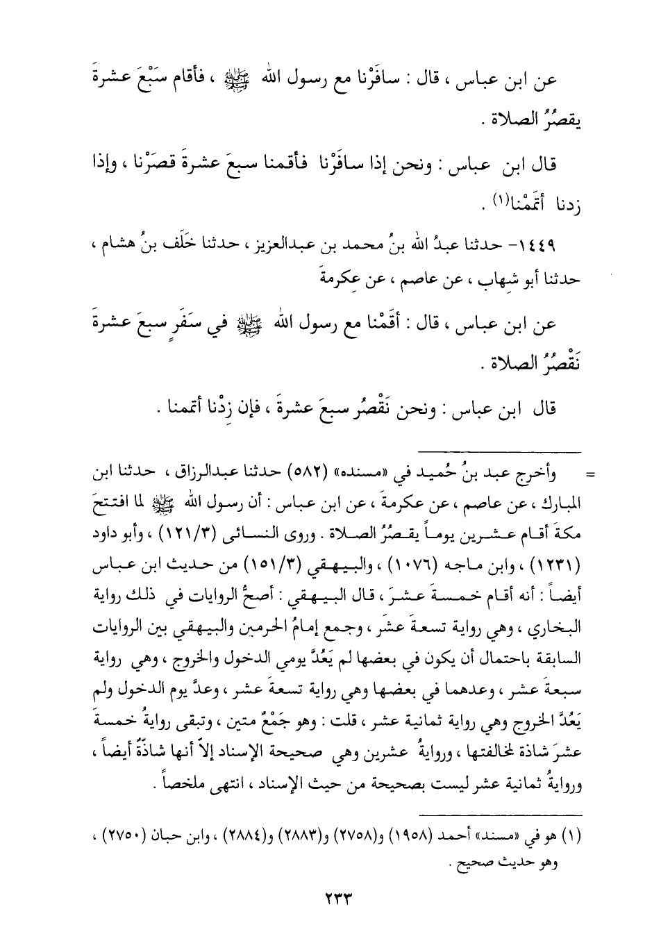 1449 - حَدَّثَنَا عَبْدُ اللَّهِ بْنُ مُحَمَّدٍ , ثنا خَلَفُ بْنُ هِشَامٍ , حَدَّثَنَا أَبُو شِهَابٍ , عَنْ عَاصِمٍ , عَنْ عِكْرِمَةَ , عَنِ ابْنِ عَبَّاسٍ , قَالَ: «أَقَمْنَا مَعَ رَسُولِ اللَّهِ صَلَّى اللهُ عَلَيْهِ وَسَلَّمَ §فِي سَفَرٍ سَبْعَ عَشْرَةَ نَقْصُرُ الصَّلَاةَ». قَالَ ابْنُ عَبَّاسٍ: وَنَحْنُ نَقْصُرُ سَبْعَ عَشْرَةَ , فَإِنْ زِدْنَا أَتْمَمْنَا