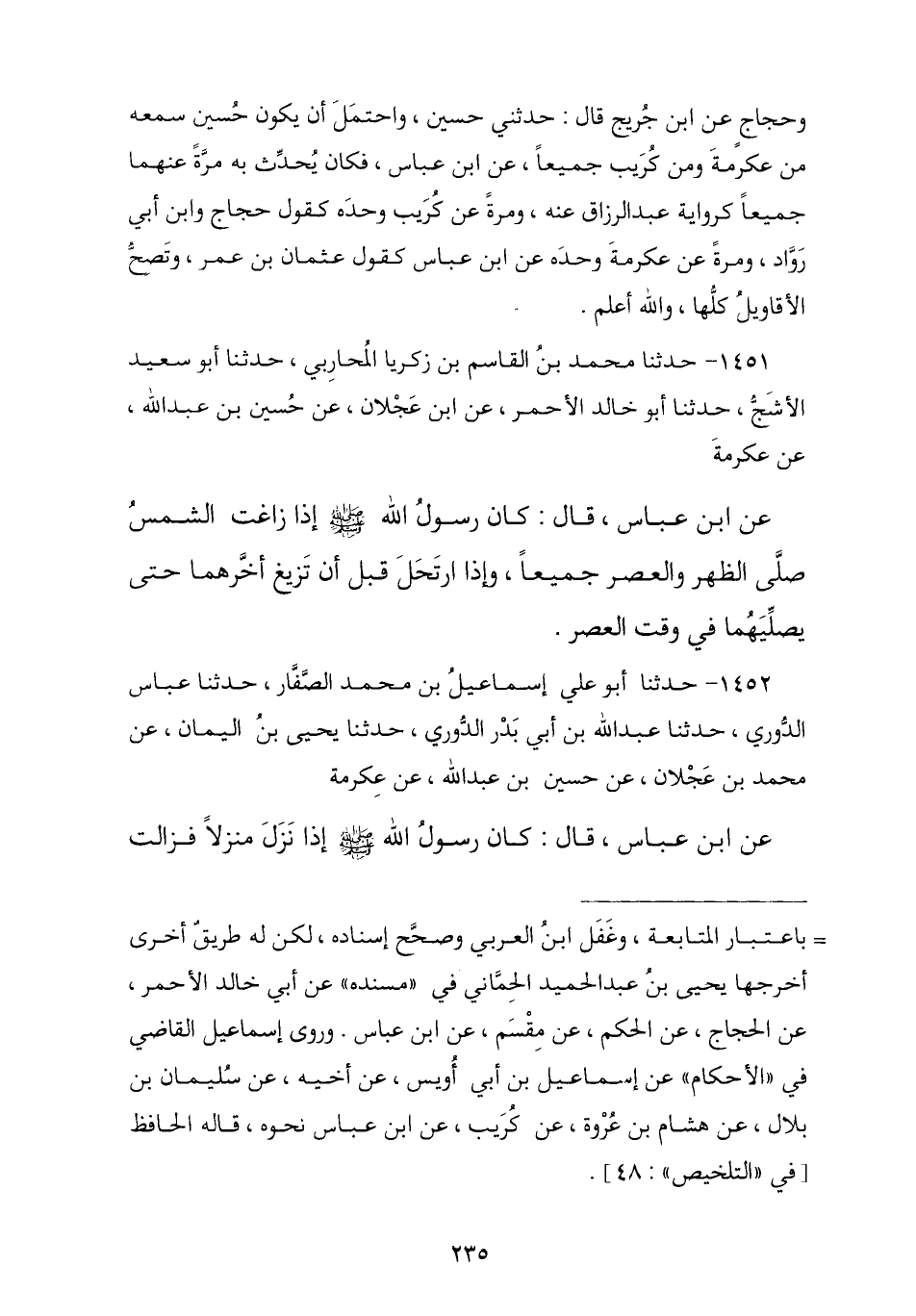 1451 - حَدَّثَنَا مُحَمَّدُ بْنُ الْقَاسِمِ بْنِ زَكَرِيَّا الْمُحَارِبِيُّ , ثنا أَبُو سَعِيدٍ الْأَشَجُّ , ثنا أَبُو خَالِدٍ الْأَحْمَرُ , عَنِ ابْنِ عَجْلَانَ , عَنْ حُسَيْنِ بْنِ عَبْدِ اللَّهِ , عَنْ عِكْرِمَةَ , عَنِ ابْنِ عَبَّاسٍ , قَالَ: كَانَ رَسُولُ اللَّهِ صَلَّى اللهُ عَلَيْهِ وَسَلَّمَ «إِذَا زَاغَتِ الشَّمْسُ §صَلَّى الظُّهْرَ وَالْعَصْرَ جَمِيعًا , وَإِذَا ارْتَحَلَ قَبْلَ أَنْ تَزِيغَ أَخَّرَهُمَا حَتَّى يُصَلِّيَهُمَا فِي وَقْتِ الْعَصْرِ»