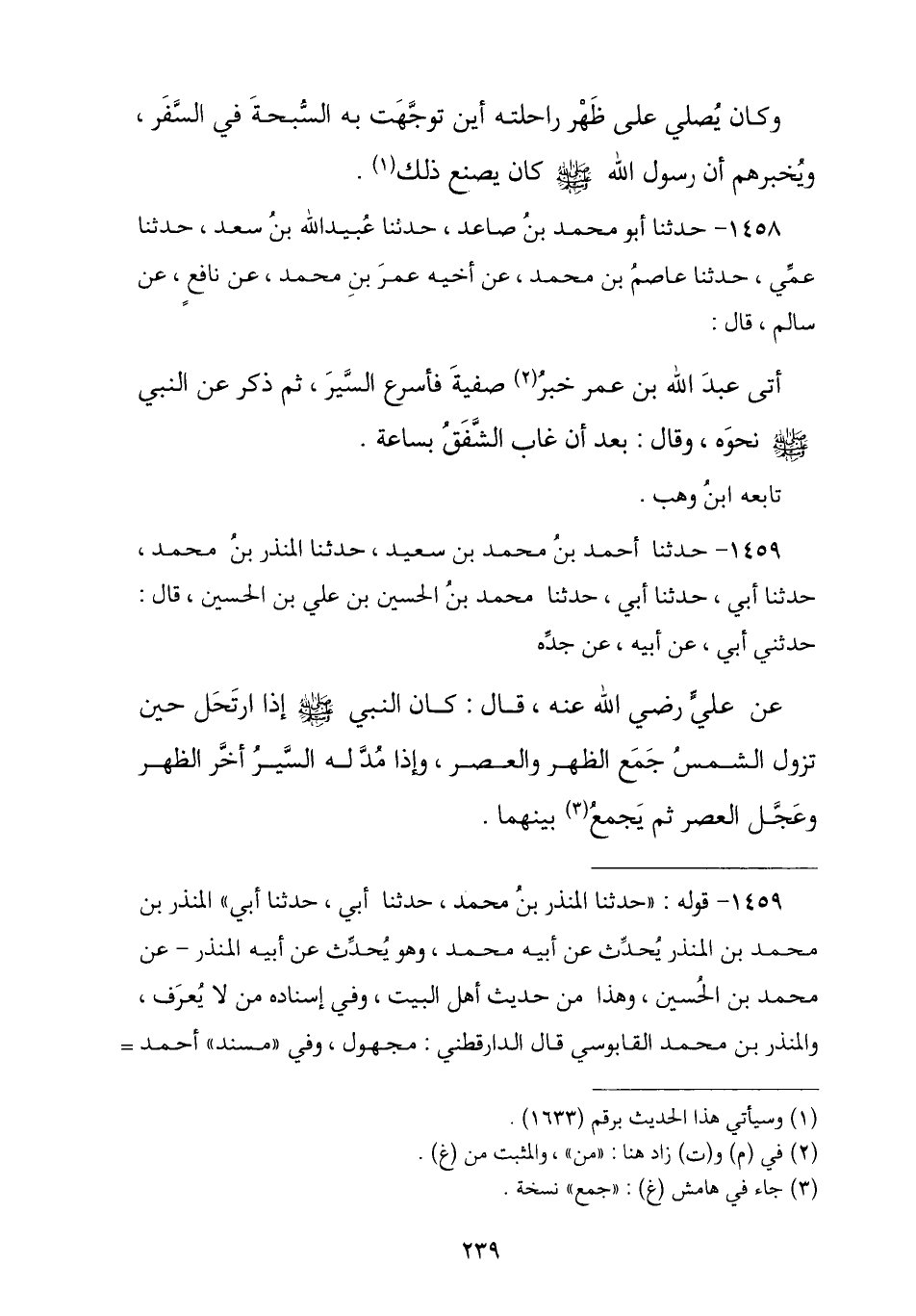 1459 - حَدَّثَنَا أَحْمَدُ بْنُ مُحَمَّدِ بْنِ سَعِيدٍ , ثنا الْمُنْذِرُ بْنُ مُحَمَّدٍ , ثنا أَبِي , ثنا أَبِي , ثنا مُحَمَّدُ بْنُ الْحُسَيْنِ بْنِ عَلِيِّ بْنِ الْحُسَيْنِ , حَدَّثَنِي أَبِي , عَنْ أَبِيهِ , عَنْ جَدِّهِ , عَنْ عَلِيٍّ رَضِيَ اللَّهُ عَنْهُ , قَالَ: كَانَ النَّبِيُّ صَلَّى اللهُ عَلَيْهِ وَسَلَّمَ «إِذَا ارْتَحَلَ حِينَ تَزُولُ الشَّمْسُ §جَمَعَ الظُّهْرَ وَالْعَصْرَ , وَإِذَا مَدَّ لَهُ السَّيْرُ أَخَّرَ الظُّهْرَ وَعَجَّلَ الْعَصْرَ ثُمَّ جَمَعَ بَيْنَهُمَا»
