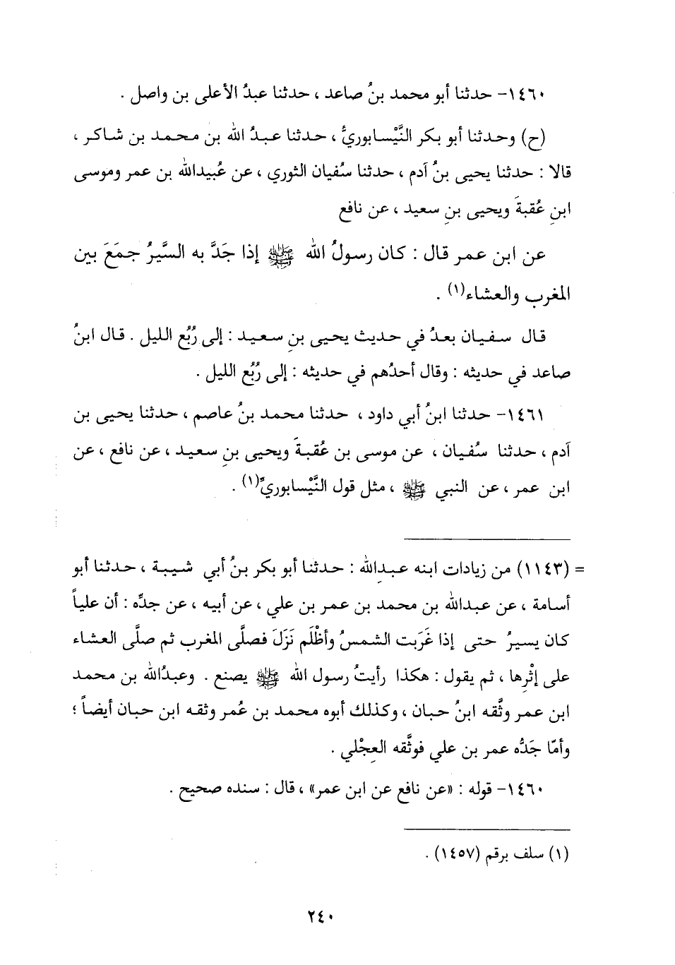 1460 - حَدَّثَنَا أَبُو مُحَمَّدِ بْنُ صَاعِدٍ , ثنا عَبْدُ الْأَعْلَى بْنُ وَاصِلٍ , ح وَحَدَّثَنَا أَبُو بَكْرٍ النَّيْسَابُورِيُّ , ثنا عَبْدُ اللَّهِ بْنُ مُحَمَّدِ بْنِ شَاكِرٍ , قَالَ: حَدَّثَنَا يَحْيَى بْنُ آدَمَ , ثنا سُفْيَانُ الثَّوْرِيُّ , عَنْ عُبَيْدِ اللَّهِ بْنِ عُمَرَ , وَمُوسَى بْنِ عُقْبَةَ , وَيَحْيَى بْنِ سَعِيدٍ , عَنْ نَافِعٍ , عَنِ ابْنِ عُمَرَ , قَالَ: كَانَ رَسُولُ اللَّهِ صَلَّى اللهُ عَلَيْهِ وَسَلَّمَ «إِذْا جَدَّ بِهِ السَّيْرُ §جَمَعَ بَيْنَ الْمَغْرِبِ وَالْعِشَاءِ». قَالَ سُفْيَانُ بَعْدُ فِي حَدِيثِ يَحْيَى بْنِ سَعِيدٍ: إِلَى رُبُعِ اللَّيْلِ , قَالَ ابْنُ صَاعِدٍ فِي حَدِيثِهِ: قَالَ أَحَدُهُمْ فِي حَدِيثِهِ: إِلَى رُبُعِ اللَّيْلِ.