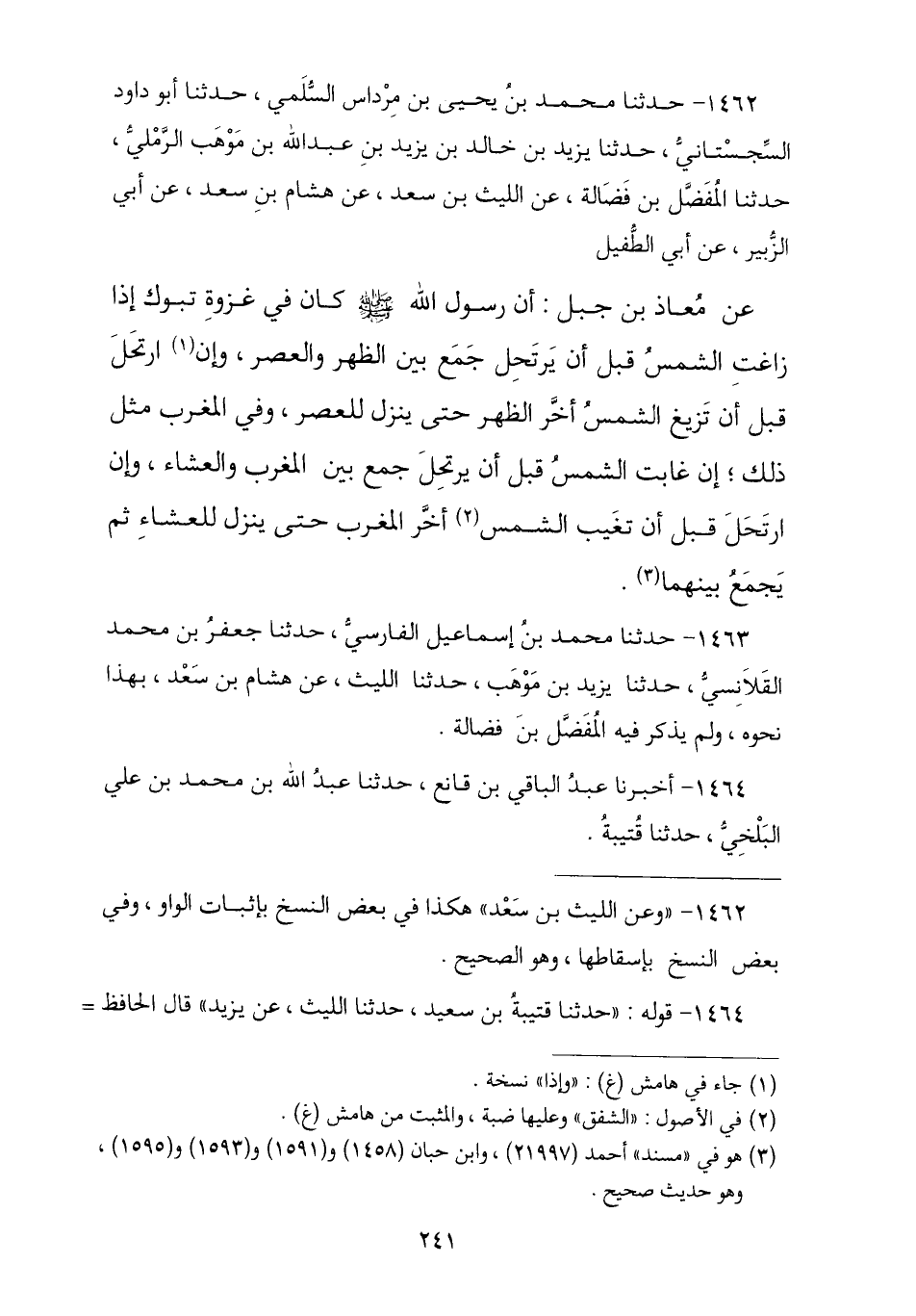 1462 - حَدَّثَنَا مُحَمَّدُ بْنُ يَحْيَى بْنِ مِرْدَاسٍ السُّلَمِيُّ , ثنا أَبُو دَاوُدَ السِّجِسْتَانِيُّ , ثنا يَزِيدُ بْنُ خَالِدِ بْنِ يَزِيدَ بْنِ عَبْدِ اللَّهِ بْنِ مَوْهَبٍ الرَّمْلِيُّ , ثنا الْمُفَضَّلُ بْنُ فَضَالَةَ , وَعَنِ اللَّيْثِ بْنِ سَعْدٍ , عَنْ هِشَامِ بْنِ سَعْدٍ , عَنْ أَبِي الزُّبَيْرِ , عَنْ أَبِي الطُّفَيْلِ , عَنْ مُعَاذِ بْنِ جَبَلٍ , أَنَّ رَسُولَ اللَّهِ صَلَّى اللهُ عَلَيْهِ وَسَلَّمَ «كَانَ فِي غَزْوَةِ تَبُوكَ إِذَا زَاغَتِ الشَّمْسُ قَبْلَ أَنْ يَرْتَحِلَ §جَمَعَ بَيْنَ الظُّهْرِ وَالْعَصْرِ , وَإِنْ تَرَحَّلَ قَبْلَ أَنْ تَزِيغَ الشَّمْسُ أَخَّرَ الظُّهْرَ حَتَّى يَنْزِلَ لِلْعَصْرِ , وَفِي الْمَغْرِبِ مِثْلَ ذَلِكَ إِنْ غَابَتِ الشَّمْسُ قَبْلَ أَنْ يَرْتَحِلَ جَمَعَ بَيْنَ الْمَغْرِبِ وَالْعِشَاءِ , فَإِنِ ارْتَحَلَ قَبْلَ أَنْ تَغِيبَ الشَّمْسُ أَخَّرَ الْمَغْرِبَ حَتَّى يَنْزِلَ لِلْعِشَاءِ ثُمَّ يَجْمَعُ بَيْنَهُمَا».