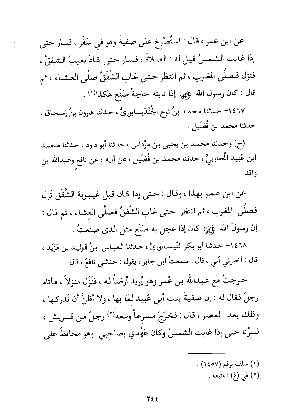 1468 - حَدَّثَنَا أَبُو بَكْرٍ النَّيْسَابُورِيُّ , أَخْبَرَنِي الْعَبَّاسُ بْنُ الْوَلِيدِ بْنِ مَزْيَدٍ , أَخْبَرَنِي أَبِي , قَالَ: سَمِعْتُ ابْنَ جَابِرٍ , يَقُولُ: حَدَّثَنِي نَافِعٌ , قَالَ: " خَرَجْتُ مَعَ عَبْدِ اللَّهِ بْنِ عُمَرَ وَهُوَ يُرِيدُ أَرْضًا لَهُ فَيَنْزِلُ مَنْزِلًا , فَأَتَاهُ رَجُلٌ فَقَالَ لَهُ: إِنَّ صَفِيَّةَ بِنْتَ أَبِي عُبَيْدٍ لَمَّا بِهَا فَلَا أَظُنُّ أَنْ تُدْرِكَهَا , وَذَلِكَ بَعْدَ الْعَصْرِ قَالَ: فَخَرَجَ مُسْرِعًا وَمَعَهُ رَجُلٌ مِنْ قُرَيْشِ فَسِرْنَا حَتَّى إِذَا غَابَتِ الشَّمْسُ وَكَانَ عَهْدِي بِصَاحِبِي وَهُوَ مُحَافِظٌ عَلَى -[245]- الصَّلَاةِ , فَقُلْتُ: الصَّلَاةُ فَلَمْ يَلْتَفِتْ إِلَيَّ وَمَضَى كَمَا هُوَ حَتَّى إِذَا كَانَ مِنْ آخِرِ الشَّفَقِ §نَزَلَ فَصَلَّى الْمَغْرِبَ ثُمَّ أَقَامَ الصَّلَاةَ وَقَدْ تَوَارَى الشَّفَقُ فَصَلَّى بِنَا الْعِشَاءَ ثُمَّ أَقْبَلَ عَلَيْنَا , فَقَالَ: كَانَ رَسُولُ اللَّهِ صَلَّى اللهُ عَلَيْهِ وَسَلَّمَ إِذَا عَجَّلَ بِهِ أَمْرٌ صَنَعَ هَكَذَا ".