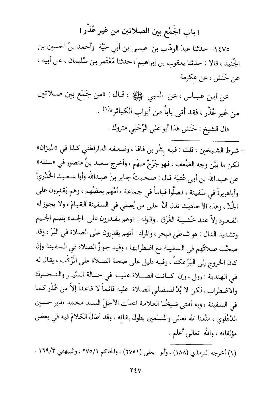 1475 - حَدَّثَنَا عَبْدُ الْوَهَّابِ بْنُ عِيسَى بْنِ أَبِي حَيَّةَ , وَأَحْمَدُ بْنُ الْحُسَيْنِ بْنِ الْجُنَيْدِ , قَالَا: نا يَعْقُوبُ بْنُ إِبْرَاهِيمَ , ثنا مُعْتَمِرُ بْنُ سُلَيْمَانَ , عَنْ أَبِيهِ , عَنْ حَنَشٍ , عَنْ عِكْرِمَةَ , عَنِ ابْنِ عَبَّاسٍ , عَنِ النَّبِيِّ صَلَّى اللهُ عَلَيْهِ وَسَلَّمَ قَالَ: § «مَنْ جَمَعَ بَيْنَ صَلَاتَيْنِ مِنْ غَيْرِ عُذْرٍ فَقَدْ أَتَى بَابًا مِنْ أَبْوَابِ الْكَبَائِرِ». حَنَشٌ هَذَا أَبُو عَلِيٍّ الرَّحَبِيُّ مَتْرُوكِ
