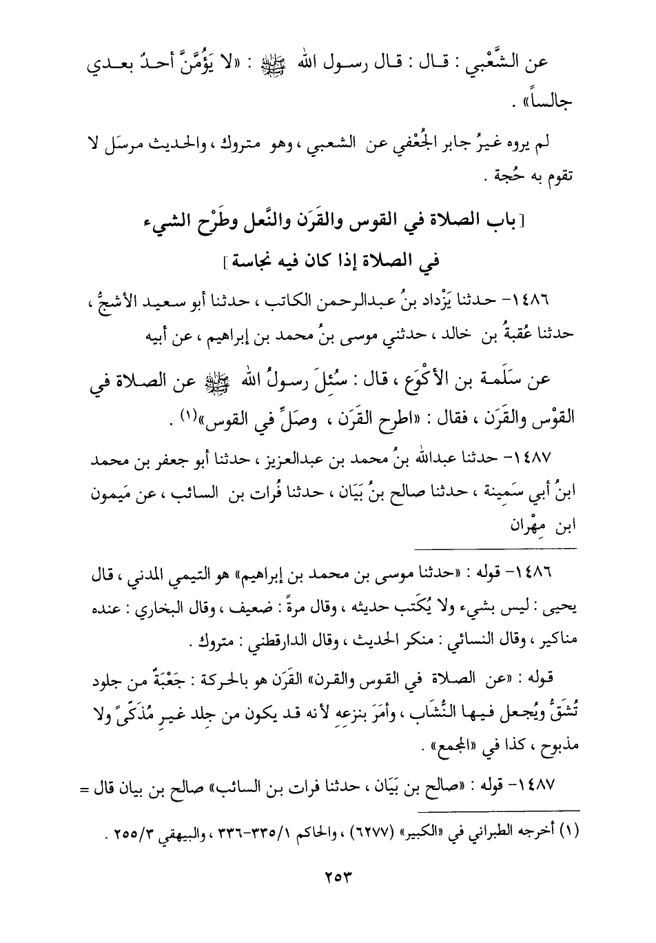 1486 - حَدَّثَنَا يَزْدَادُ بْنُ عَبْدِ الرَّحْمَنِ الْكَاتِبُ , ثنا أَبُو سَعِيدٍ الْأَشَجُّ , ثنا عُقْبَةُ بْنُ خَالِدٍ , ثنا مُوسَى بْنُ مُحَمَّدِ بْنِ إِبْرَاهِيمَ , عَنْ أَبِيهِ , عَنْ سَلَمَةَ بْنِ الْأَكْوَعِ , قَالَ: سُئِلَ رَسُولُ اللَّهِ صَلَّى اللهُ عَلَيْهِ وَسَلَّمَ عَنِ الصَّلَاةَ فِي الْقَوْسِ وَالْقَرْنِ , فَقَالَ: § «اطْرَحِ الْقَرْنَ وَصَلِّ فِي الْقَوْسِ»
