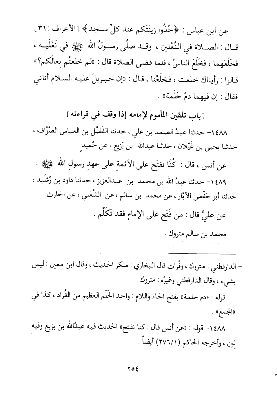 1489 - حَدَّثَنَا عَبْدُ اللَّهِ بْنُ مُحَمَّدِ بْنِ عَبْدِ الْعَزِيزِ , ثنا دَاوُدُ بْنُ رُشَيْدٍ , ثنا أَبُو حَفْصٍ الْأَبَّارُ , عَنْ مُحَمَّدِ بْنِ سَالِمٍ , عَنِ الشَّعْبِيِّ , عَنِ الْحَارِثِ , عَنْ عَلِيٍّ , قَالَ: § «مَنْ فَتَحَ عَلَى الْإِمَامِ فَقَدْ تَكَلَّمَ». مُحَمَّدُ بْنُ سَالِمٍ ضَعِيفٌ مَتْرُوكٌ