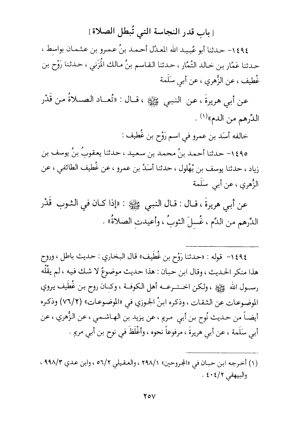 1494 - حَدَّثَنَا أَبُو عَبْدِ اللَّهِ الْمُعَدَّلُ أَحْمَدُ بْنُ عَمْرِو بْنِ عُثْمَانَ بِوَاسِطَ , حَدَّثَنَا عَمَّارُ بْنُ خَالِدٍ التَّمَّارُ , ثنا الْقَاسِمُ بْنُ مَالِكٍ الْمُزَنِيُّ , ثنا رَوْحُ بْنُ غُطَيْفٍ , عَنِ الزُّهْرِيِّ , عَنْ أَبِي سَلَمَةَ , عَنْ أَبِي هُرَيْرَةَ , عَنِ النَّبِيِّ صَلَّى اللهُ عَلَيْهِ وَسَلَّمَ , قَالَ: § «تُعَادُ الصَّلَاةُ مِنْ قَدْرِ الدِّرْهَمِ مِنَ الدَّمِ». خَالَفَهُ أَسَدُ بْنُ عَمْرٍو فِي اسْمِ رَوْحِ بْنِ غُطَيْفٍ , فَسَمَّاهُ غُطَيْفًا وَوَهِمَ فِيهِ