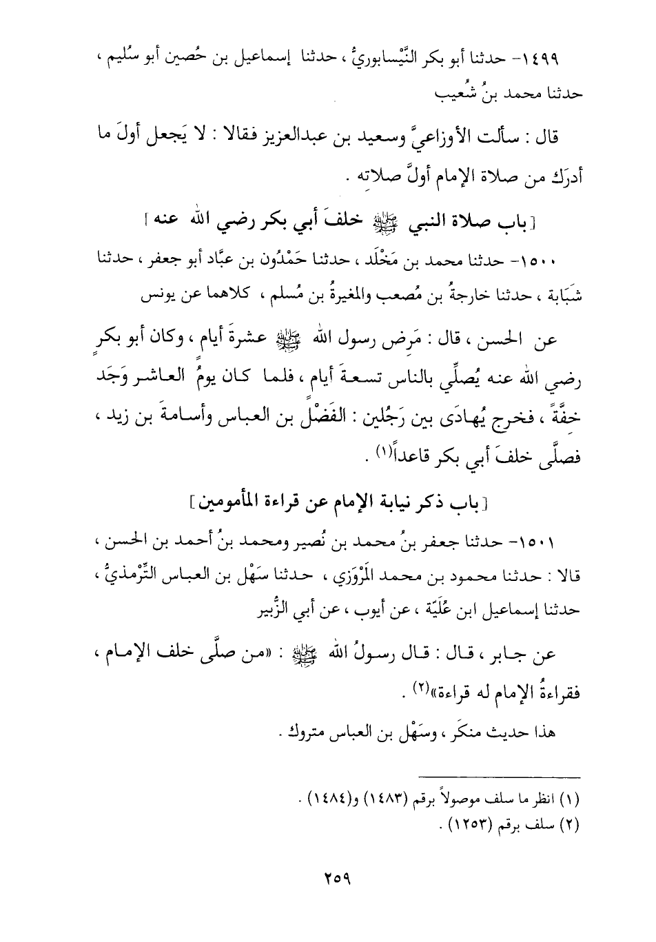 1501 - حَدَّثَنَا جَعْفَرُ بْنُ مُحَمَّدِ بْنِ نُصَيْرٍ , وَمُحَمَّدُ بْنُ أَحْمَدَ بْنِ الْحَسَنِ , قَالَا: حَدَّثَنَا مَحْمُودُ بْنُ مُحَمَّدٍ الْمَرْوَزِيُّ , ثنا سَهْلُ بْنُ الْعَبَّاسِ التِّرْمِذِيُّ , ثنا إِسْمَاعِيلُ ابْنُ عُلَيَّةَ , عَنْ أَيُّوبَ , عَنْ أَبِي الزُّبَيْرِ , عَنْ جَابِرٍ , قَالَ: قَالَ رَسُولُ اللَّهِ صَلَّى اللهُ عَلَيْهِ وَسَلَّمَ: § «مَنْ صَلَّى خَلْفَ الْإِمَامِ فَقِرَاءَةُ الْإِمَامُ لَهُ قِرَاءَةٌ». هَذَا حَدِيثٌ مُنْكَرٌ , وَسَهْلُ بْنُ الْعَبَّاسِ مَتْرُوكٌ