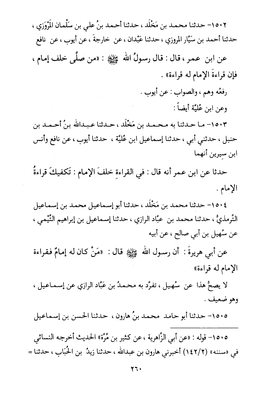 1503 - مَا ثنا بِهِ مُحَمَّدُ بْنُ مَخْلَدٍ , ثنا عَبْدُ اللَّهِ بْنُ أَحْمَدَ بْنِ حَنْبَلٍ , حَدَّثَنِي أَبِي , ثنا إِسْمَاعِيلُ ابْنُ عُلَيَّةَ , ثنا أَيُّوبُ , عَنْ نَافِعٍ , وَأَنَسِ بْنِ سِيرِينَ , أَنَّهُمَا حُدِّثَا عَنِ ابْنِ عُمَرَ , أَنَّهُ قَالَ فِي الْقِرَاءَةِ خَلْفَ الْإِمَامِ: § «تَكْفِيكَ قِرَاءَةُ الْإِمَامِ»