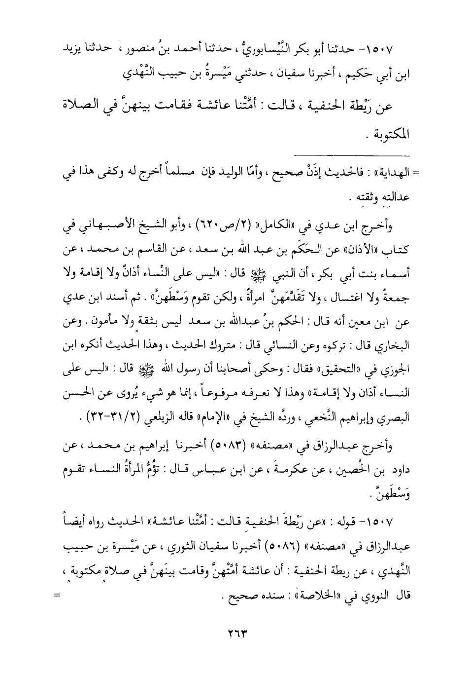 1507 - حَدَّثَنَا أَبُو بَكْرٍ النَّيْسَابُورِيُّ , ثنا أَحْمَدُ بْنُ مَنْصُورٍ , ثنا يَزِيدُ بْنُ أَبِي حَكِيمٍ , أَخْبَرَنَا سُفْيَانُ , حَدَّثَنِي مَيْسَرَةُ بْنُ حَبِيبٍ النَّهْدِيُّ , عَنْ رَيْطَةَ الْحَنَفِيَّةِ , قَالَتْ: «أَمَّتْنَا عَائِشَةُ §فَقَامَتْ بَيْنَهُنَّ فِي الصَّلَاةِ الْمَكْتُوبَةِ»