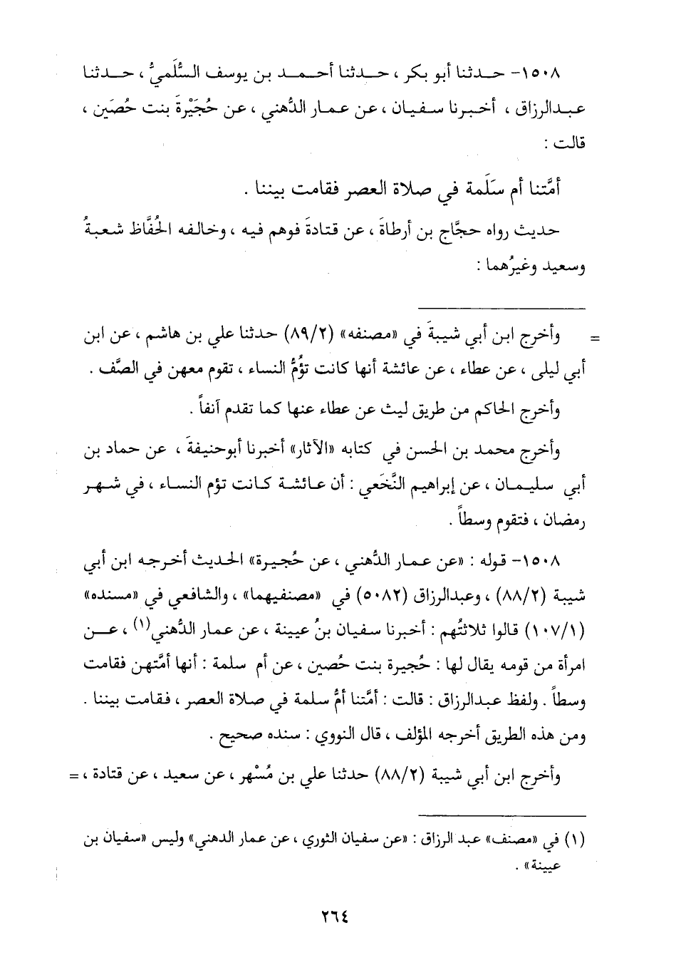1508 - حَدَّثَنَا أَبُو بَكْرٍ , ثنا أَحْمَدُ بْنُ يُوسُفَ السُّلَمِيُّ , ثنا عَبْدُ الرَّحْمَنِ , أنا سُفْيَانُ , عَنْ عَمَّارٍ الدُّهْنِيِّ , عَنْ حُجَيْرَةَ بِنْتِ حُصَيْنٍ , قَالَتْ: «أَمَّتْنَا أُمُّ سَلَمَةَ فِي صَلَاةِ الْعَصْرِ §فَقَامَتْ بَيْنَنَا». حَدِيثٌ رَوَاهُ الْحَجَّاجُ بْنُ أَرْطَأَةَ , عَنْ قَتَادَةَ فَوَهِمَ فِيهِ , وَخَالَفَهُ الْحُفَّاظُ شُعْبَةُ , وَسَعِيدٌ وَغَيْرُهُمَا
