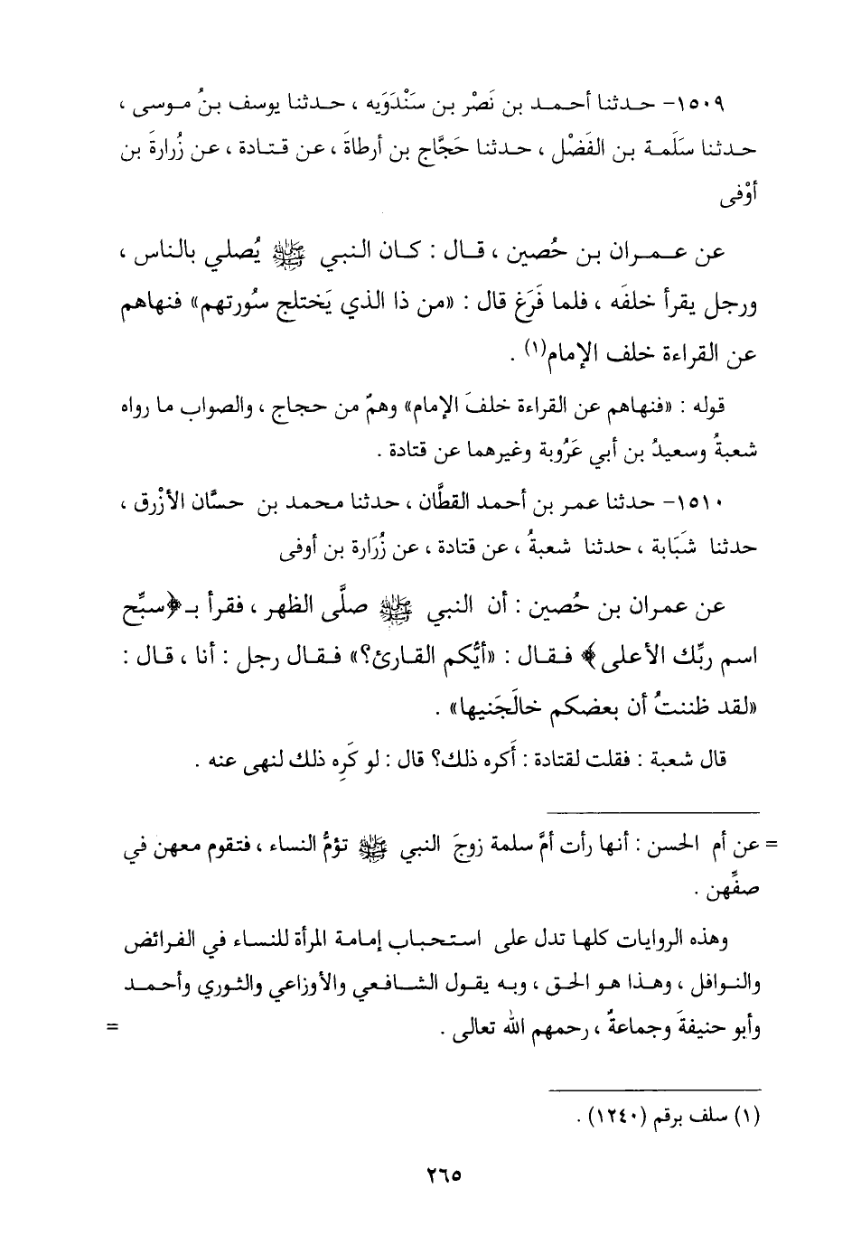 1509 - حَدَّثَنَا أَحْمَدُ بْنُ نَصْرِ بْنِ سَنْدَوَيْهِ , ثنا يُوسُفُ بْنُ مُوسَى , ثنا سَلَمَةُ بْنُ الْفَضْلِ , ثنا حَجَّاجُ بْنُ أَرْطَأَةَ , عَنْ قَتَادَةَ , عَنْ زُرَارَةَ بْنِ أَوْفَى , عَنْ عِمْرَانَ بْنِ حُصَيْنٍ , قَالَ: كَانَ النَّبِيُّ صَلَّى اللهُ عَلَيْهِ وَسَلَّمَ يُصَلِّي بِالنَّاسِ وَرَجُلٌ يَقْرَأُ خَلْفَهُ فَلَمَّا فَرَغَ قَالَ: § «مَنْ ذَا الَّذِي يَخْتَلِجُ سُورَتَهُمْ؟» , فَنَهَاهُمْ عَنِ الْقِرَاءَةِ خَلْفَ الْإِمَامِ. قَوْلُهُ: فَنَهَاهُمْ عَنِ الْقِرَاءَةِ خَلْفَ الْإِمَامِ وَهْمٌ مِنْ حَجَّاجٍ وَالصَّوَابُ مَا رَوَاهُ شُعْبَةُ وَسَعِيدُ بْنُ أَبِي عَرُوبَةَ وَغَيْرُهُمَا عَنْ قَتَادَةَ