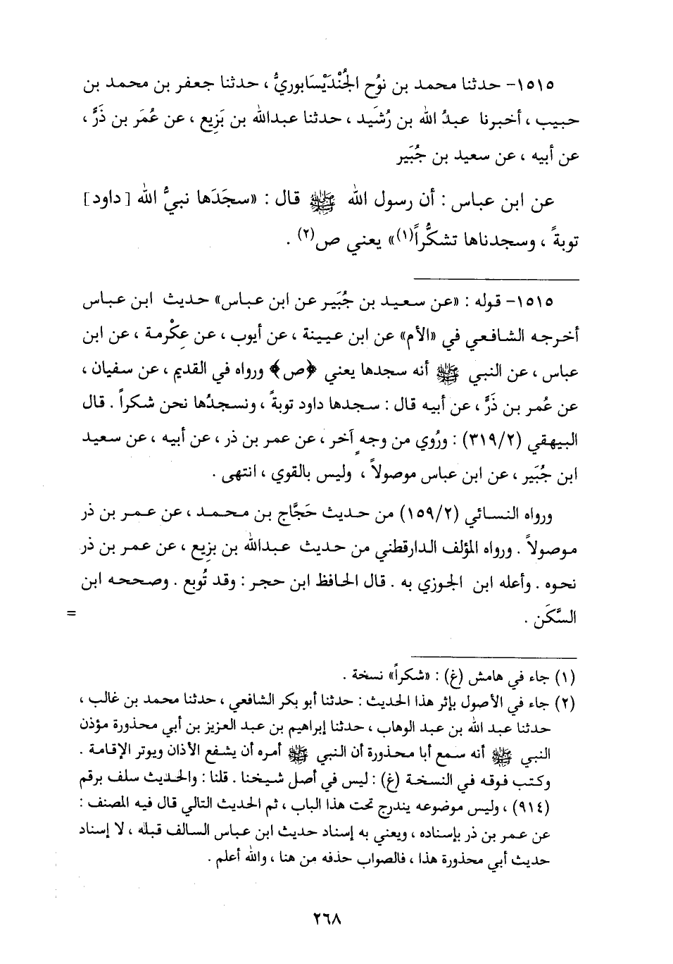 1515 - حَدَّثَنَا مُحَمَّدُ بْنُ نُوحٍ الْجُنْدِيسَابُورِيُّ , نا جَعْفَرُ بْنُ مُحَمَّدِ بْنِ حَبِيبٍ , أنا عَبْدُ اللَّهِ بْنُ رُشَيْدٍ , نا عَبْدُ اللَّهِ بْنُ بَزِيعٍ , عَنْ عُمَرَ بْنِ ذَرٍّ , عَنْ أَبِيهِ , عَنْ سَعِيدِ بْنِ جُبَيْرٍ , عَنِ ابْنِ عَبَّاسٍ , أَنَّ رَسُولَ اللَّهِ صَلَّى اللهُ عَلَيْهِ وَسَلَّمَ قَالَ: § «سَجَدَهَا نَبِيُّ اللَّهِ دَاوُدُ تَوْبَةً , وَسَجَدْنَاهَا شُكْرًا» يَعْنِي ص