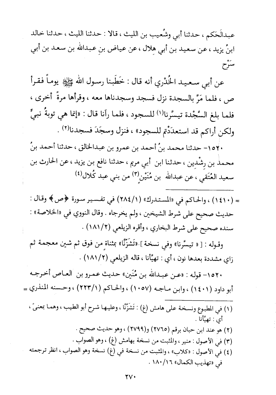 1520 - حَدَّثَنَا مُحَمَّدُ بْنُ أَحْمَدَ بْنِ عَمْرِو بْنِ عَبْدِ الْخَالِقِ , نا أَحْمَدُ بْنُ مُحَمَّدِ بْنِ رِشْدِينَ , نا ابْنُ أَبِي مَرْيَمَ , نا نَافِعُ بْنُ يَزِيدَ , عَنِ الْحَارِثِ بْنِ سَعِيدٍ الْعُتَقِيِّ , عَنْ عَبْدِ اللَّهِ بْنِ مُنَيْنٍ مِنْ بَنِي عَبْدِ كُلَالٍ , -[271]- عَنْ عَمْرِو بْنِ الْعَاصِ , أَنَّ رَسُولَ اللَّهِ صَلَّى اللهُ عَلَيْهِ وَسَلَّمَ § «أَقْرَأَهُ خَمْسَ عَشْرَةَ سَجْدَةً فِي الْقُرْآنِ , مِنْهَا ثَلَاثٌ فِي الْمُفَصَّلِ وَفِي سُورَةِ الْحَجِّ سَجْدَتَيْنِ»