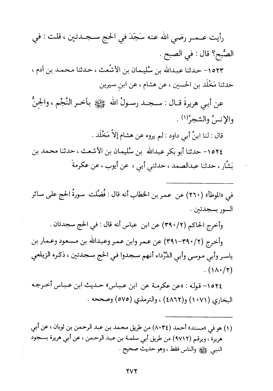 1523 - حَدَّثَنَا عَبْدُ اللَّهِ بْنُ سُلَيْمَانَ بْنِ الْأَشْعَثِ , نا مُحَمَّدُ بْنُ آدَمَ , نا مَخْلَدُ بْنُ الْحُسَيْنِ , عَنْ هِشَامٍ , عَنِ ابْنِ سِيرِينَ , عَنْ أَبِي هُرَيْرَةَ , قَالَ: § «سَجَدَ رَسُولُ اللَّهِ صَلَّى اللهُ عَلَيْهِ وَسَلَّمَ بِآخِرِ النَّجْمِ , وَالْجِنُّ وَالْإِنْسُ وَالشَّجَرُ». قَالَ: حَدَّثَنَا ابْنُ أَبِي دَاوُدَ لَمْ يَرْوِهِ عَنْ هِشَامٍ إِلَّا مَخْلَدٌ