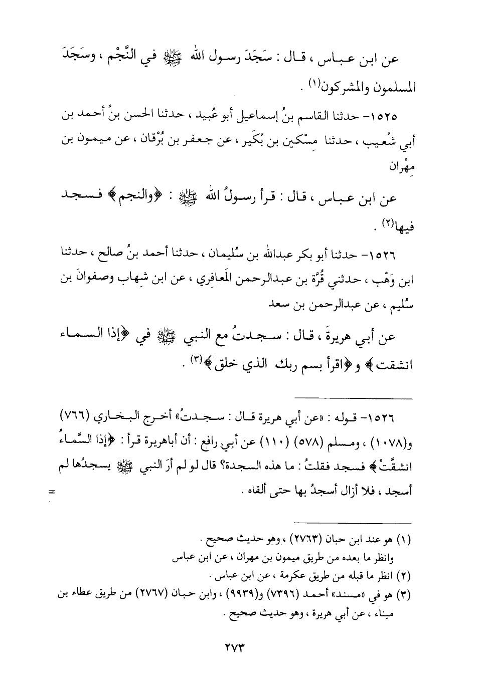 1525 - حَدَّثَنَا الْقَاسِمُ بْنُ إِسْمَاعِيلَ أَبُو عُبَيْدٍ , ثنا الْحَسَنُ بْنُ أَحْمَدَ بْنِ أَبِي شُعَيْبٍ , ثنا مِسْكِينُ بْنُ بُكَيْرٍ , عَنْ جَعْفَرِ بْنِ بُرْقَانَ , عَنْ مَيْمُونِ بْنِ مِهْرَانَ , عَنِ ابْنِ عَبَّاسٍ , قَالَ: § «قَرَأَ رَسُولُ اللَّهِ صَلَّى اللهُ عَلَيْهِ وَسَلَّمَ وَالنَّجْمِ فَسَجَدَ فِيهَا»