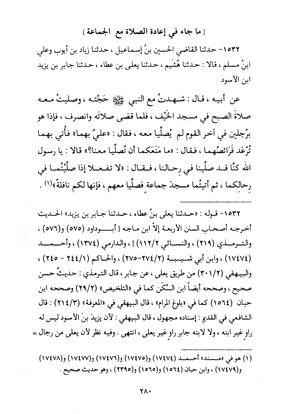 1532 - حَدَّثَنَا الْقَاضِي الْحُسَيْنُ بْنُ إِسْمَاعِيلَ , ثنا زِيَادُ بْنُ أَيُّوبَ , وَعَلِيُّ بْنُ مُسْلِمٍ , قَالَا: نا هُشَيْمٌ , ثنا يَعْلَى بْنُ عَطَاءٍ , نا جَابِرُ بْنُ يَزِيدَ بْنِ الْأَسْوَدِ , عَنْ أَبِيهِ , قَالَ: شَهِدْتُ مَعَ رَسُولِ اللَّهِ صَلَّى اللهُ عَلَيْهِ وَسَلَّمَ حَجَّتَهُ فَصَلَّيْتُ مَعَهُ صَلَاةَ الصُّبْحِ فِي مَسْجِدِ الْخَيْفِ , فَلَمَّا قَضَى صَلَاتَهُ وَانْصَرَفَ فَإِذَا هُوَ بِرَجُلَيْنِ فِي آخِرِ الْقَوْمِ لَمْ يُصَلِّيَا مَعَهُ , فَقَالَ: «عَلَيَّ بِهِمَا» , فَأُتِيَ بِهِمَا تَرْعَدُ فَرَائِصُهُمَا , فَقَالَ: «§مَا مَنَعَكُمَا أَنْ تُصَلِّيَا مَعَنَا؟» , قَالَا: يَا رَسُولَ اللَّهِ كُنَّا قَدْ صَلَّيْنَا فِي رِحَالِنَا , قَالَ: «لَا تَفْعَلَا , إِذَا صَلَّيْتُمَا فِي رِحَالِكُمَا ثُمَّ أَتَيْتُمَا مَسْجِدَ جَمَاعَةٍ فَصَلَّيَا مَعَهُمْ فَإِنَّهَا لَكُمْ نَافِلَةٌ». -[281]-