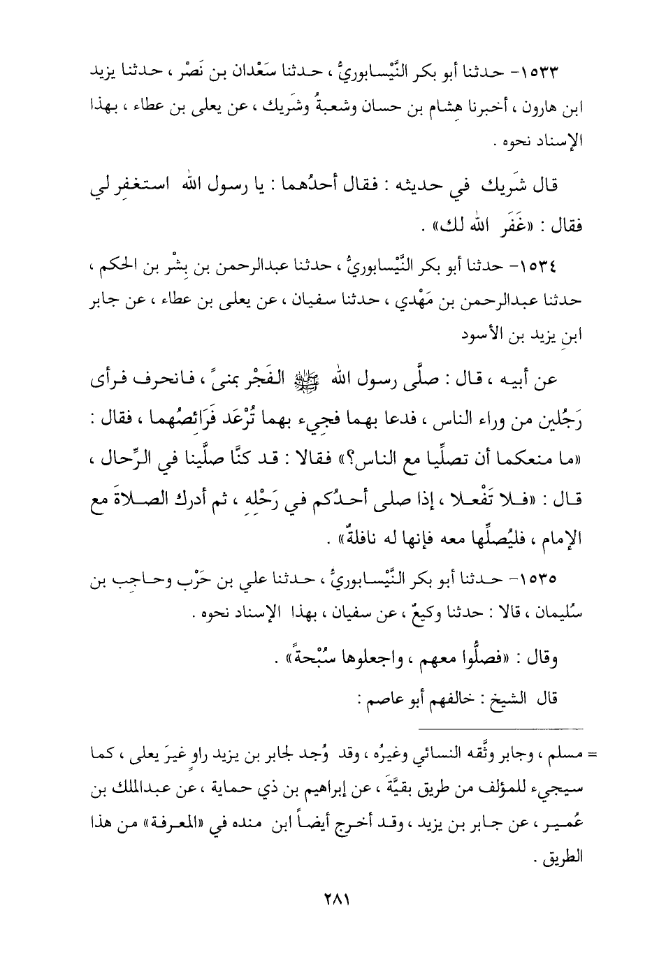 1534 - حَدَّثَنَا أَبُو بَكْرٍ النَّيْسَابُورِيُّ , ثنا عَبْدُ الرَّحْمَنِ بْنُ بِشْرِ بْنِ الْحَكَمِ , ثنا عَبْدُ الرَّحْمَنِ بْنُ مَهْدِيٍّ , ثنا سُفْيَانُ , عَنْ يَعْلَى بْنِ عَطَاءٍ , عَنْ جَابِرِ بْنِ يَزِيدَ بْنِ الْأَسْوَدِ , عَنْ أَبِيهِ , قَالَ: صَلَّى رَسُولُ اللَّهِ صَلَّى اللهُ عَلَيْهِ وَسَلَّمَ الْفَجْرَ بِمِنًى فَانْحَرَفَ فَرَأَى رَجُلَيْنِ مِنْ وَرَاءِ النَّاسِ , فَدَعَا بِهِمَا فَجِيءَ بِهِمَا تَرْعَدُ فَرَائِصُهُمَا , فَقَالَ: § «مَا مَنَعَكُمَا أَنْ تُصَلِّيَا مَعَ النَّاسِ؟» , فَقَالَا: قَدْ كُنَّا صَلَّيْنَا فِي الرِّحَالِ , فَقَالَ: «فَلَا تَفْعَلَا , إِذَا صَلَّى أَحَدُكُمْ فِي رَحْلِهِ ثُمَّ أَدْرَكَ الصَّلَاةَ مَعَ الْإِمَامِ فَلْيُصَلِّهَا مَعَهُ فَإِنَّهَا لَهُ نَافِلَةٌ».