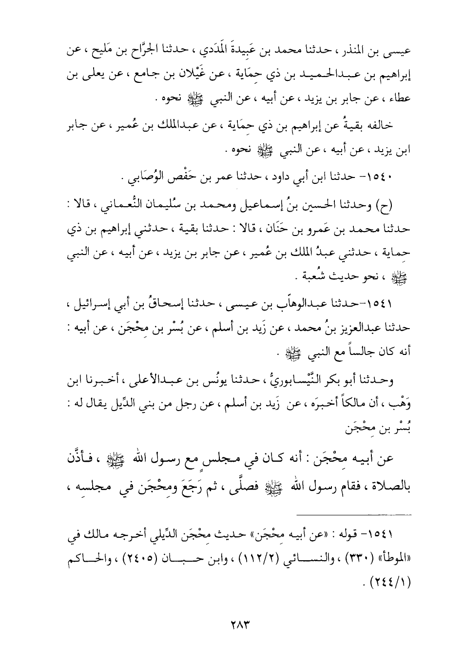 1541 - حَدَّثَنَا عَبْدُ الْوَهَّابِ بْنُ عِيسَى , ثنا إِسْحَاقُ بْنُ أَبِي إِسْرَائِيلَ , ثنا عَبْدُ الْعَزِيزِ بْنُ مُحَمَّدٍ , عَنْ زَيْدِ بْنِ أَسْلَمَ , عَنْ بُسْرِ بْنِ مِحْجَنٍ , عَنْ أَبِيهِ , أَنَّهُ كَانَ جَالِسًا مَعَ النَّبِيِّ صَلَّى اللهُ عَلَيْهِ وَسَلَّمَ ح وَحَدَّثَنَا أَبُو بَكْرٍ النَّيْسَابُورِيُّ , ثنا يُونُسُ بْنُ عَبْدِ الْأَعْلَى , أنا ابْنُ وَهْبٍ , أَنَّ مَالِكًا أَخْبَرَهُ , عَنْ زَيْدِ بْنِ أَسْلَمَ , عَنْ رَجُلٍ مِنْ بَنِي الدِّيَلِ يُقَالُ لَهُ: بُسْرُ بْنُ مِحْجَنٍ , عَنْ أَبِيهِ مِحْجَنٍ أَنَّهُ كَانَ فِي مَجْلِسٍ مَعَ رَسُولِ اللَّهِ صَلَّى اللهُ عَلَيْهِ وَسَلَّمَ فَأَذَّنَ فِي الصَّلَاةِ فَقَامَ رَسُولُ اللَّهِ صَلَّى اللهُ عَلَيْهِ وَسَلَّمَ فَصَلَّى ثُمَّ رَجَعَ وَمِحْجَنٌ فِي مَجْلِسِهِ , -[284]- فَقَالَ رَسُولُ اللَّهِ صَلَّى اللهُ عَلَيْهِ وَسَلَّمَ: § «مَا مَنَعَكَ أَنْ تُصَلِّيَ مَعَ النَّاسِ؟ أَلَسْتَ بِرَجُلٍ مُسْلِمٍ؟» , قَالَ: بَلَى يَا رَسُولَ اللَّهِ وَلَكِنْ كُنْتُ قَدْ صَلَّيْتُ فِي أَهْلِي , فَقَالَ لَهُ رَسُولُ اللَّهِ صَلَّى اللهُ عَلَيْهِ وَسَلَّمَ: «إِذَا جِئْتَ فَصَلِّ مَعَ النَّاسِ وَإِنْ كُنْتَ قَدْ صَلَّيْتَ». اللَّفْظُ لِحَدِيثِ مَالِكٍ وَالْمَعْنَى وَاحِدٌ