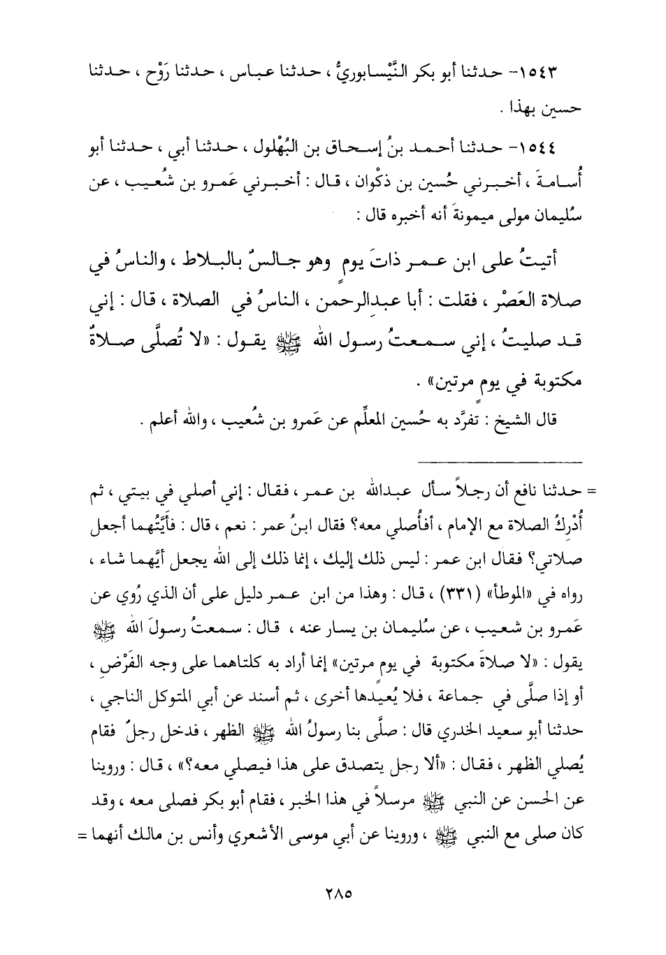 1544 - حَدَّثَنَا أَحْمَدُ بْنُ إِسْحَاقَ بْنِ بُهْلُولٍ , ثنا أَبِي , نا أَبُو أُسَامَةَ , أَخْبَرَنِي حُسَيْنُ بْنُ ذَكْوَانَ , أَخْبَرَنِي عَمْرُو بْنُ شُعَيْبٍ , أَخْبَرَنِي سُلَيْمَانُ مَوْلَى مَيْمُونَةَ , قَالَ: أَتَيْتُ عَلَى ابْنِ عُمَرَ ذَاتَ يَوْمٍ وَهُوَ جَالِسٌ بِالْبَلَاطِ وَالنَّاسُ فِي صَلَاةِ الْعَصْرِ فَقُلْتُ: أَبَا عَبْدِ الرَّحْمَنِ النَّاسُ فِي الصَّلَاةِ؟ قَالَ: إِنِّي قَدْ صَلَّيْتُ , إِنِّي سَمِعْتُ رَسُولَ اللَّهِ صَلَّى اللهُ عَلَيْهِ وَسَلَّمَ يَقُولُ: § «لَا تُصَلَّى صَلَاةً مَكْتُوبَةً فِي يَوْمٍ مَرَّتَيْنِ». تَفَرَّدَ بِهِ حُسَيْنٌ الْمُعَلِّمُ , عَنْ عَمْرِو بْنِ شُعَيْبٍ وَاللَّهُ أَعْلَمُ