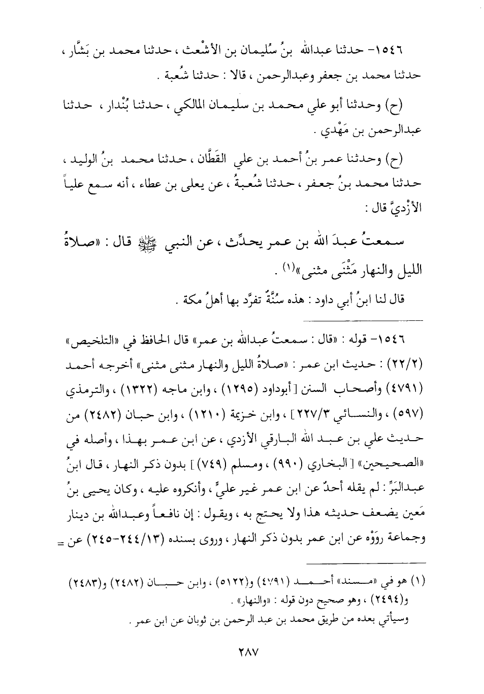 1546 - حَدَّثَنَا عَبْدُ اللَّهِ بْنُ سُلَيْمَانَ بْنِ الْأَشْعَثِ , ثنا مُحَمَّدُ بْنُ بَشَّارٍ , ثنا مُحَمَّدُ بْنُ جَعْفَرٍ , وَعَبْدُ الرَّحْمَنِ , قَالَا: نا شُعْبَةُ , ح وَحَدَّثَنَا أَبُو عَلِيٍّ الْمَالِكِيُّ مُحَمَّدُ بْنُ سُلَيْمَانَ , ثنا بُنْدَارٌ , ثنا عَبْدُ الرَّحْمَنِ بْنُ مَهْدِيٍّ , ح وَحَدَّثَنَا عُمَرُ بْنُ أَحْمَدَ بْنِ عَلِيٍّ الْقَطَّانُ , ثنا مُحَمَّدُ بْنُ الْوَلِيدِ , ثنا مُحَمَّدُ بْنُ جَعْفَرٍ , قَالَا: نا شُعْبَةُ , عَنْ يَعْلَى بْنِ عَطَاءٍ , أَنَّهُ سَمِعَ عَلِيًّا الْأَزْدِيَّ , قَالَ: سَمِعْتُ عَبْدَ اللَّهِ بْنَ عُمَرَ , يُحَدِّثُ عَنِ النَّبِيِّ صَلَّى اللهُ عَلَيْهِ وَسَلَّمَ , قَالَ: § «صَلَاةُ اللَّيْلِ وَالنَّهَارِ مَثْنَى مَثْنَى». قَالَ لَنَا ابْنُ أَبِي دَاوُدَ: هَذِهِ سُنَّةٌ تَفَرَّدَ بِهَا أَهْلُ مَكَّةَ