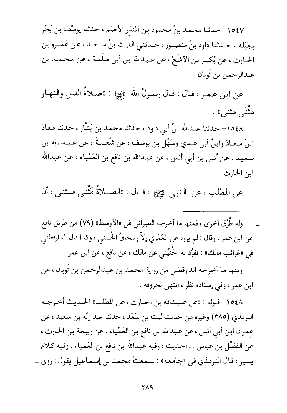 1547 - حَدَّثَنَا مُحَمَّدُ بْنُ مَحْمُودِ بْنِ الْمُنْذِرِ الْأَصَمُّ , ثنا يُوسُفُ بْنُ بَحْرٍ بِجَبَلَةَ , ثنا دَاوُدُ بْنُ مَنْصُورٍ , حَدَّثَنِي اللَّيْثُ بْنُ سَعْدٍ , عَنْ عَمْرِو بْنِ الْحَارِثِ , عَنْ بُكَيْرِ بْنِ الْأَشَجِّ , عَنْ عَبْدِ اللَّهِ بْنِ أَبِي سَلَمَةَ , عَنْ مُحَمَّدِ بْنِ عَبْدِ الرَّحْمَنِ بْنِ ثَوْبَانَ , عَنِ ابْنِ عُمَرَ , قَالَ: قَالَ رَسُولُ اللَّهِ صَلَّى اللهُ عَلَيْهِ وَسَلَّمَ: § «صَلَاةُ اللَّيْلِ وَالنَّهَارِ مَثْنَى مَثْنَى»